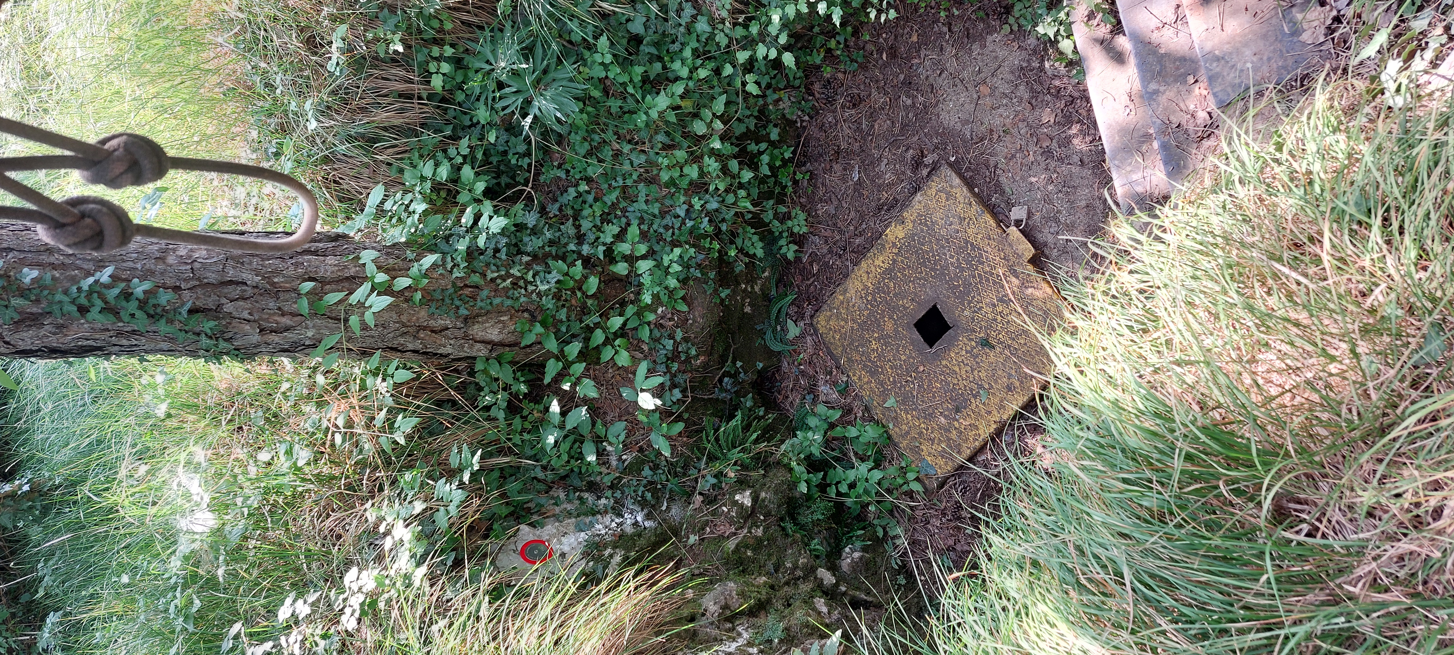 Dalla botola d’ingresso una prima rampa di scale (10 metri) porta ad uno stretto ripiano in nicchia da cui si prosegue per altri sei sino ad un ripiano da cui la cavità prosegue con uno stretto pozzo profondo tre metri. Alla sua base s’apre una frattura (80 x 150) che sprofonda in un pozzo di 27 metri che si scende soltanto per i primi 24 ove un breve passaggio porta aisuccessiv1 P4 e P11 impostati su una non troppo larga frattura. Al suo termine - siamo giunti a quota -60 - segue una breve serie di pozzi armati con vari spezzoni di scale (5, 3, 6, 5, 3) sino ad uno stretto pianerottolo (quota -82). La cavità prosegue, sempre verticale, con un P13 (rampe di scale di 8, 2, 3 m), un breve cunicolo, un altro P3, un ulteriore cunicolo, un P1,5 ed un P20 intervallato da esili cenge (scale in ferro di 8, 3, 5, 4 m) giungendo così a quota -120.