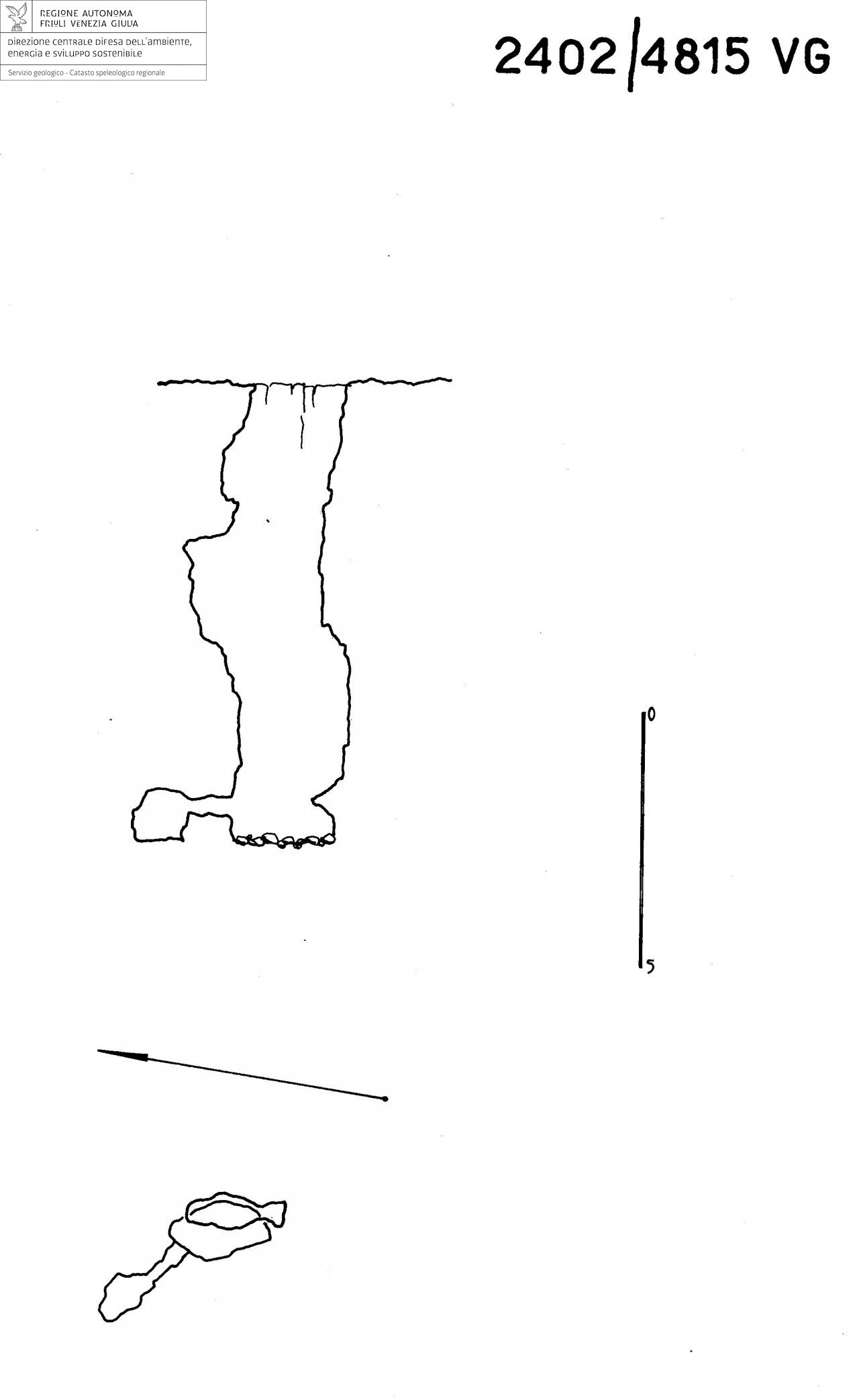 La cavità è caratterizzata da uno stretto ed accidentato pozzetto, impostato su di una frattura orientata secondo N-S. A mezzo metro dal fondo, in direzione NW, si apre un angusto cunicolo che termina dopo un paio di metri.