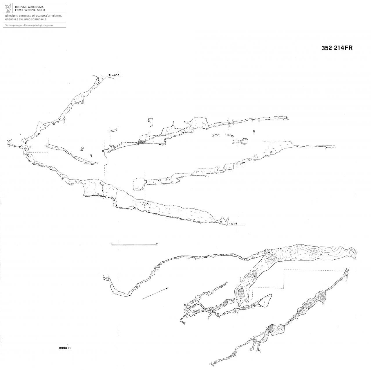 Il primo a sinistra conduce ad una pozza d'acqua, di là dalla quale il fango e le pietre ostruiscono il passaggio (punti B 17, 18). Il secondo (punti 14,15,27) dopo alcuni metri si trasforma in una fessura impraticabile, che si ricollega sia alla galleria principale, sia a quella terminale.