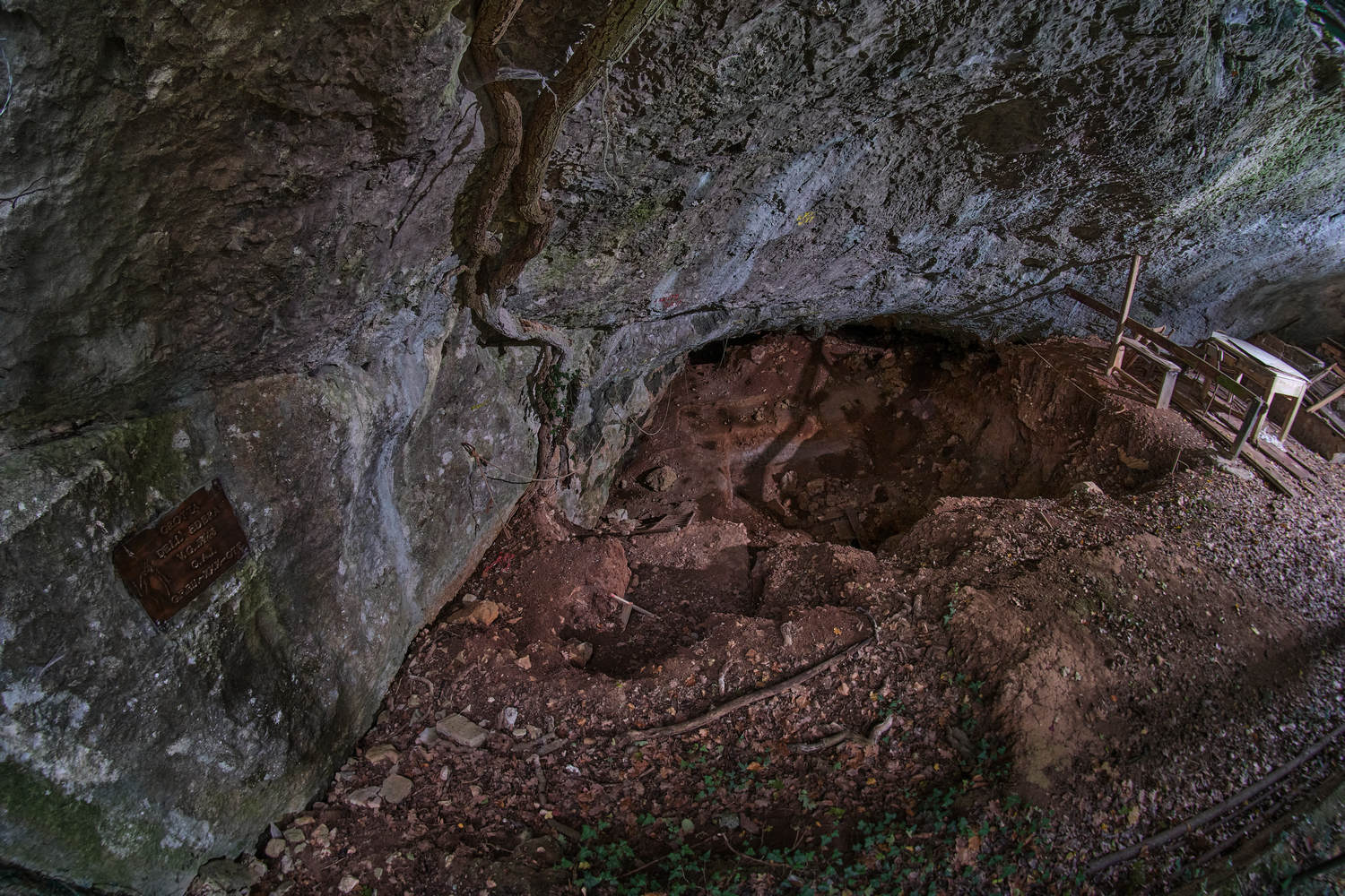 Si tratta di una caverna non molto fonda e larga una decina di metri. Gli scavi misero in luce un deposito formato in prevalenza da terriccio scuro, con poche pietre, che tendeva a diventare argilloso negli strati più profondi. Nella parte superficiale del riempimento, insieme a materiali romani, si rinvennero pure una lama di coltello e una cuspide di giavellotto in ferro. Pochi frammenti di ceramiche del tipo castelliere segnavano il deposito dell'età del ferro. Il successivo deposito dell'età del bronzo ha dato qualche esempio di ceramica decorata a falsa cordicella, un colatoio e cuspidi di selce. L'eneolitico era contraddistinto da ceramiche decorate a Besenstrich, numerosi manufatti di selce tra cui un bifacciale foliato. Al neolitico appartengono vasi a tulipano impostati su piede cavo e decorati ad incisioni; un vaso presenta un graffito a scacchiera mentre un altro è dipinto con macchioline puntiformi disposte a più file. Segue quindi il deposito con industrie mesolitiche che è stato esplorato su una ristretta superficie, tuttavia sufficiente per dimostrare che esistono strette analogie nelle caratteristiche e nella sequenza stratigrafica con il deposito della Grotta Azzurra di Samatorza. Lo scavo sotto il livello mesolitico, per 4 m di profondità, in un poderoso deposito d'argilla rossa e grossi blocchi, ha dato esito negativo.