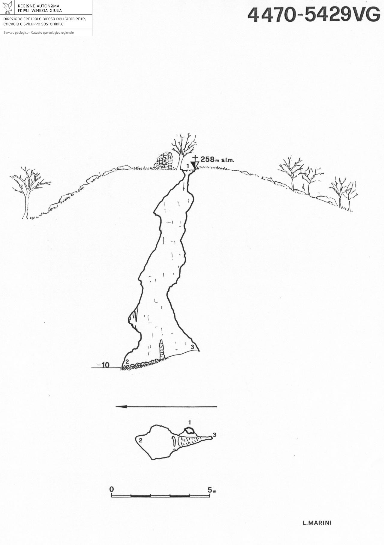 Pozzo unico, piuttosto stretto, che si sviluppa lungo una frattura orientata N-S. Le pareti del pozzo sono molto concrezionate ed in una nicchia, che s'apre a pochi metri dalla base, ci sono alcune formazioni stalagmitiche. Il fondo è costituito da argilla mista a pietrisco e da uno scivolo concrezionato; una lama alta circa 1m, staccatasi dalla parte superiore del pozzo, divide a metà questo vano terminale.
