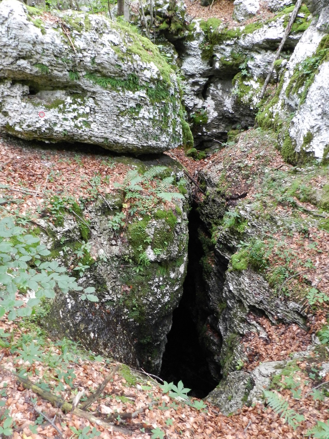 Il primo pozzo d'ingresso si trova in una piccola depressione; poco più avanti, lungo la stessa frattura si apre il secondo pozzo d'accesso che, dopo qualche metro, sbocca come il precedente nella caverna principale, lunga una decina di metri, alta 8m e larga altrettanto. Lungo la parete Nord si notano due cunicoli impraticabili che conducono nella bassa cavernetta successiva, nella quale si arriva anche attraverso una comoda galleria bassa e larga, saltuariamente attiva, che termina dopo una decina di metri ostruita da una frana. Gli altri due pozzi esterni portano su di un unico ripiano ricoperto da innumerevoli detriti e tronchi d'albero da cui con un salto di 5m si raggiunge la galleria che porta alla caverna principale.