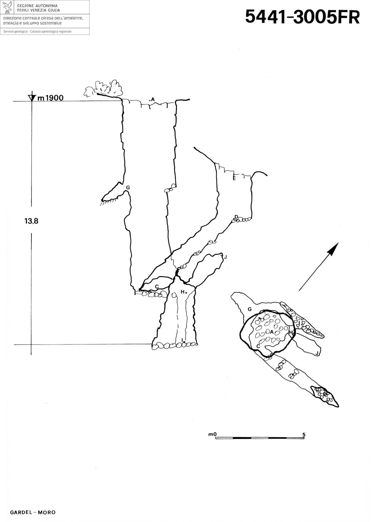 La cavità si apre con un unico pozzo di sezione approssimativamente circolare del diametro di circa 3m. A circa 5m di profondità il pozzo si restringe leggermente (diametro di 2m) terminando con fondo detritico a -11m. Attraverso una finestra (punto C del rilievo) è possibile raggiungere, con una galleria inclinata, il secondo ingresso che è più basso del primo ed è costituito da un pozzetto-fessura di 3m.