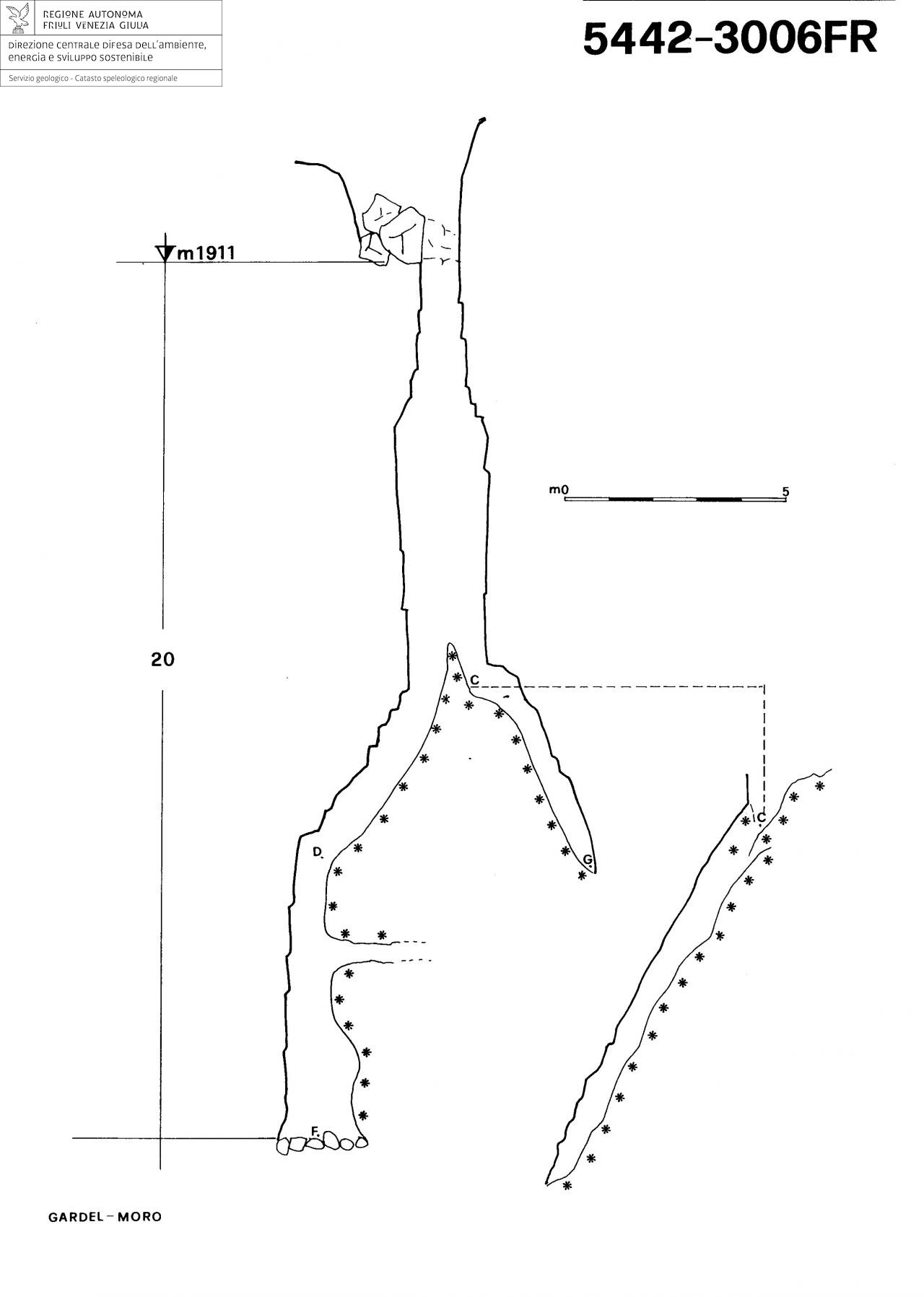 Dalla base del primo salto è possibile proseguire in tre direzioni: un primo pozzo di 10m, dapprima inclinato poi verticale, tra roccia e neve gelata porta alla profondità di 20m; il fondo di questo pozzo è costituito da detriti e non vi è possibilità di prosecuzione. Si nota come il blocco di neve ghiacciata che costituisce il pozzo d'accesso sia sospeso sopra uno spazio vuoto che lo separa da un altro deposito nivale.
