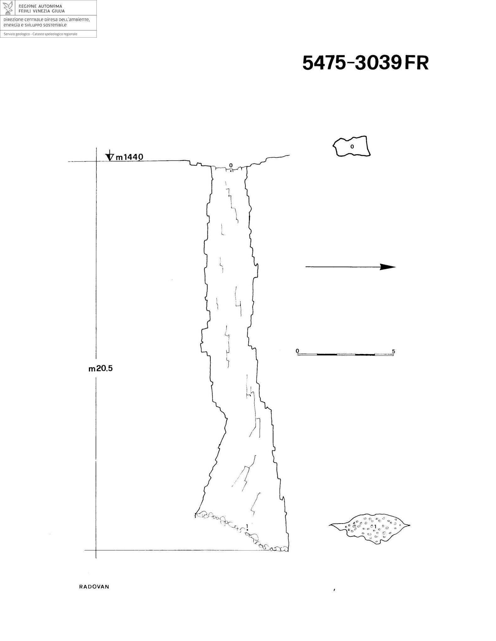 La cavità è impostata su di una frattura avente direzione N-S. L'andamento generale del pozzo è sub-verticale. Sul fondo si può notare un leggero accenno di allargamento dei volumi interni. Molto probabilmente questo allargamento è stato originato da fenomeni di gelifrazione e distacchi spontanei, provocando l'ostruzione delle possibili vie di prosecuzione.