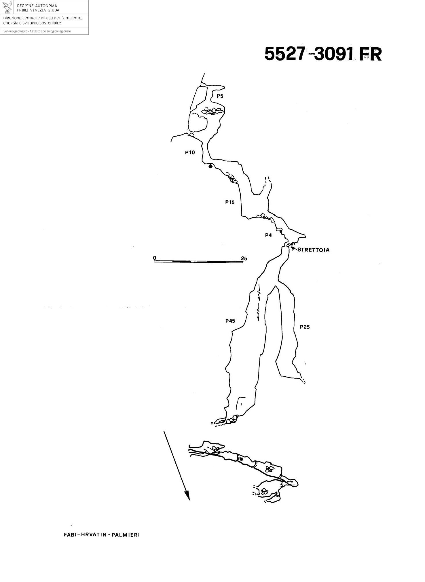 Dopo alcuni pozzetti, una strettoia allargata artificialmente immette sul pozzo da 45m, alla base del quale, una stretta fessura tra roccia e pietre dalla quale esce una notevole corrente d'aria, blocca questa cavità alla profondità di 90m. Una finestra a circa -10 del p.45 immette in un pozzo parallelo che dopo 25m si ferma tra frana e strettoia.