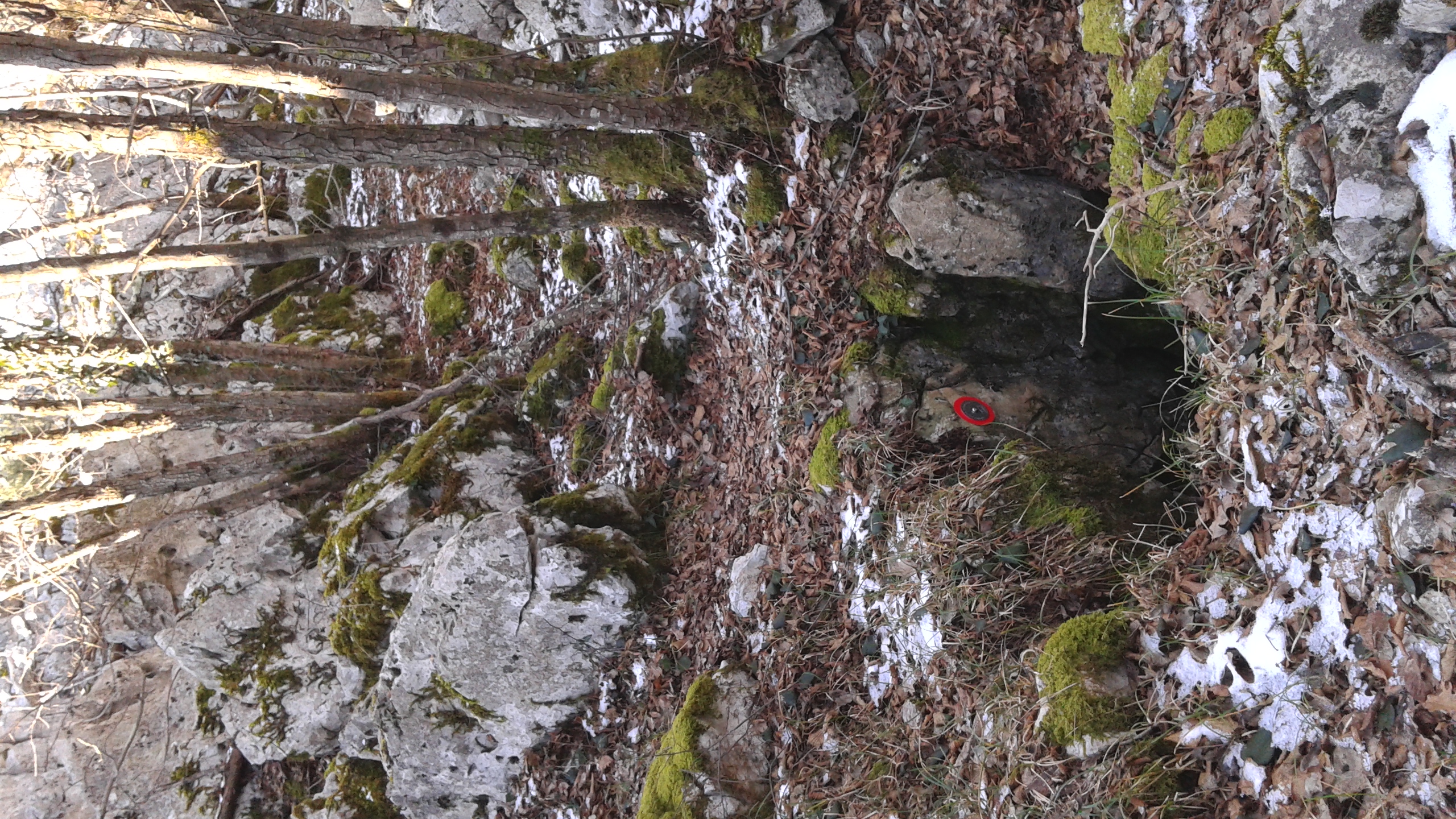 L'ingresso è situato sul fianco SW di una dolina, quasi a ridosso di un muretto a secco.