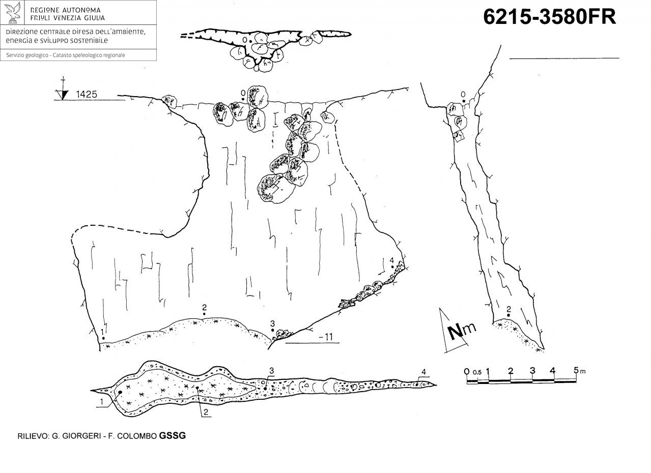La cavità è impostata su di una frattura con direzione 290° - 110°. Nella grotta vi sono depositi di ghiaccio e neve. L'ingresso è ingombro di grossi massi provenienti da crolli della parte superiore dell'ingresso.