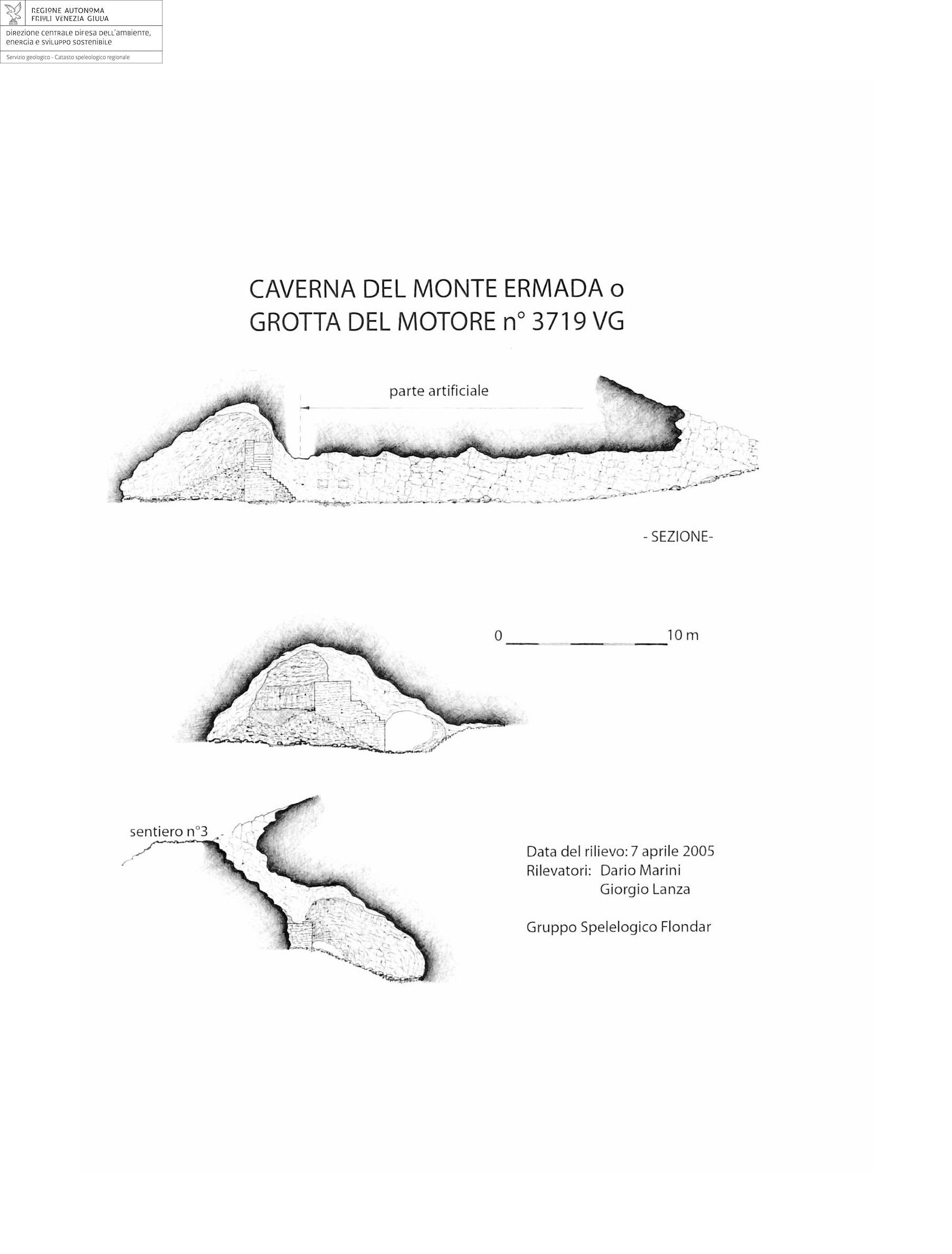 Il nome Grotta del Motore deriva all'uso che ne fecero gli austro-ungarici durante la Grande Guerra: al suo interno c'erano dei gruppi elettrogeni che fornivano la corrente elettrica alle altre grotte sull'Ermada e alle linee del fronte.