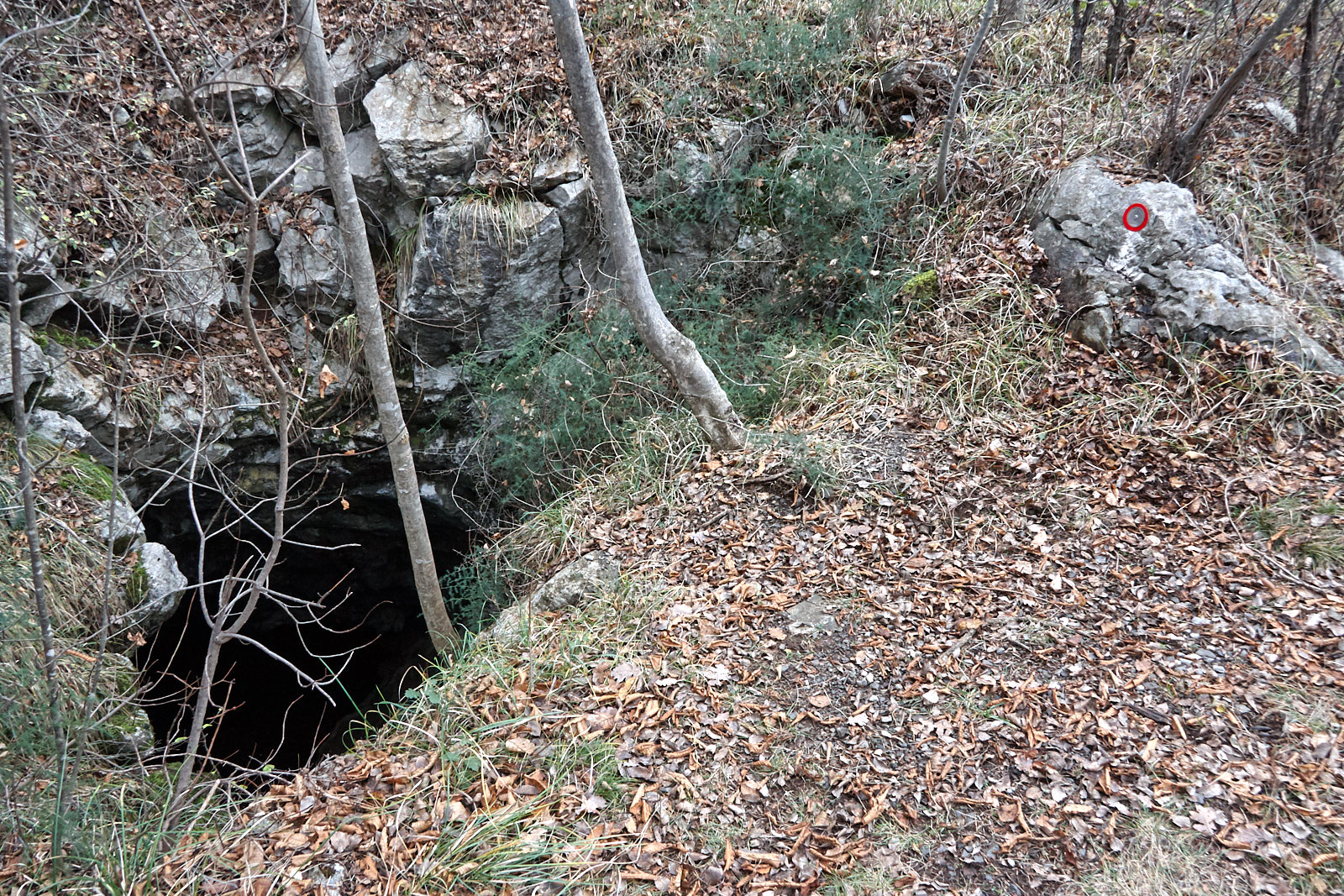 I due ingressi della grotta si aprono ai lati di una carrareccia che gira attorno al Monte Hermada.