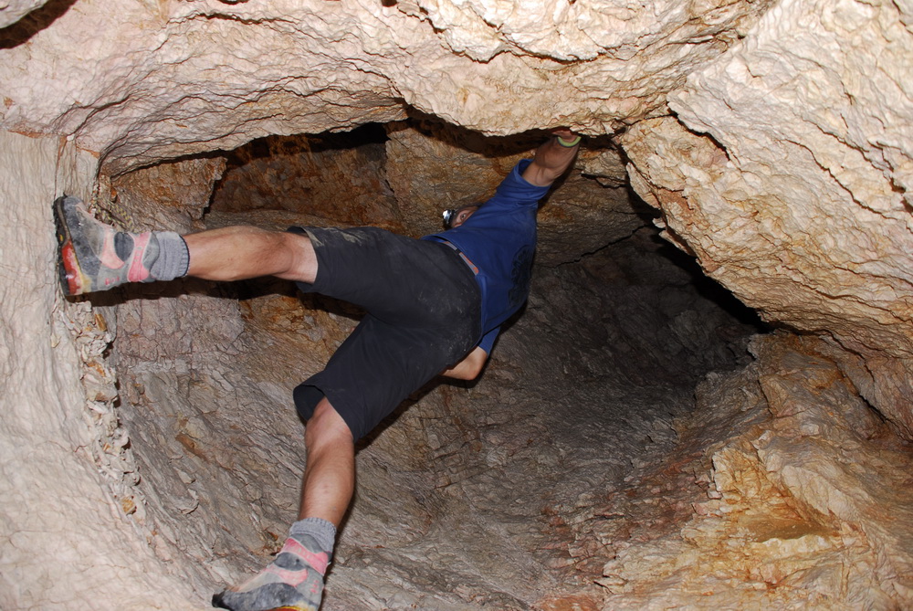 Entrati nella breve galleria iniziali e sceso il pozzetto di 4 metri (anche senza attrezzatura) si trovano 2 cunicoli ascendenti con accumuli di detrito. Quello superiore (punto 5 del rilievo) è caratterizzato da corrente d'aria in uscita.