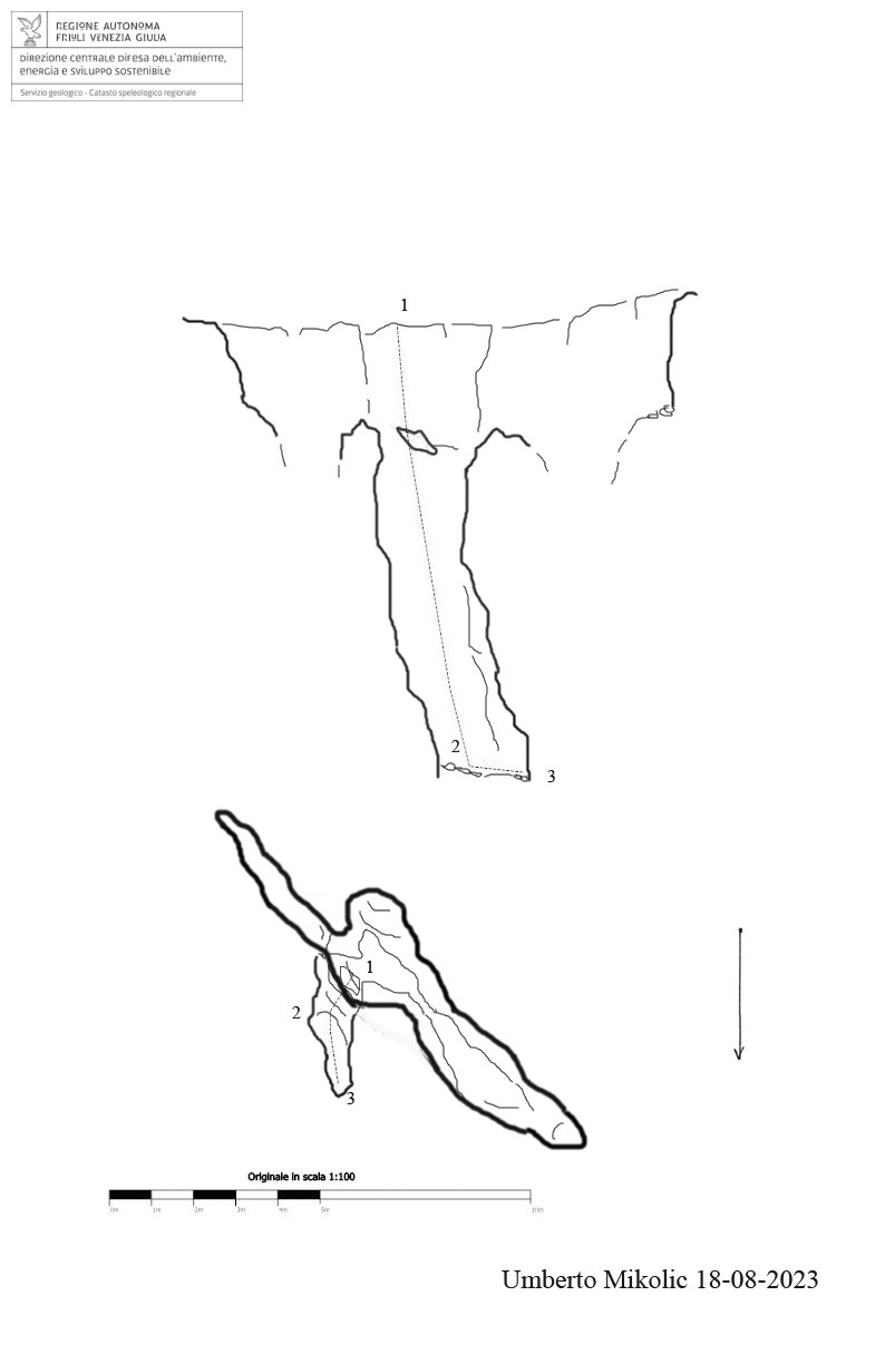 S’apre ad una trentina di metri sulla sinistra della traccia di sentiero che dal bivacco Bortolutti porta verso Cima Mogenza Grande, sul fondo di una piccola dolina.