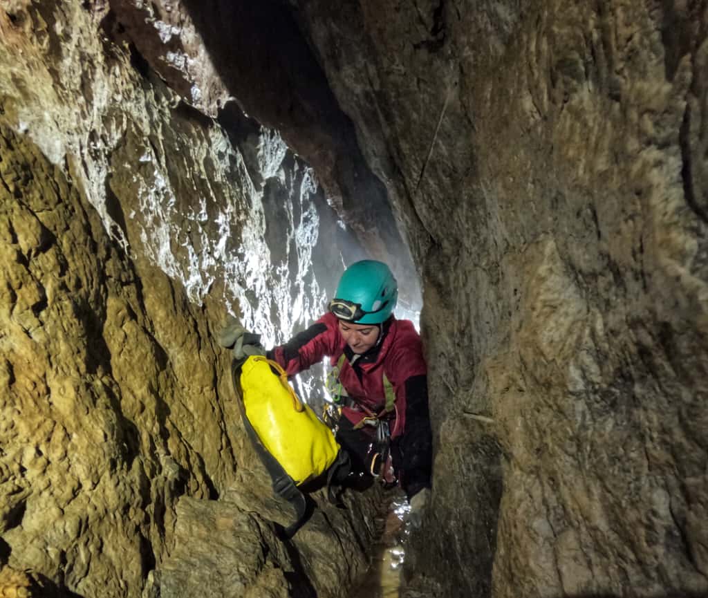 La cavità terminava a -115 m e una prosecuzione evidente si presentava da un piccolo meandro percorso da un rivolo d’acqua.
