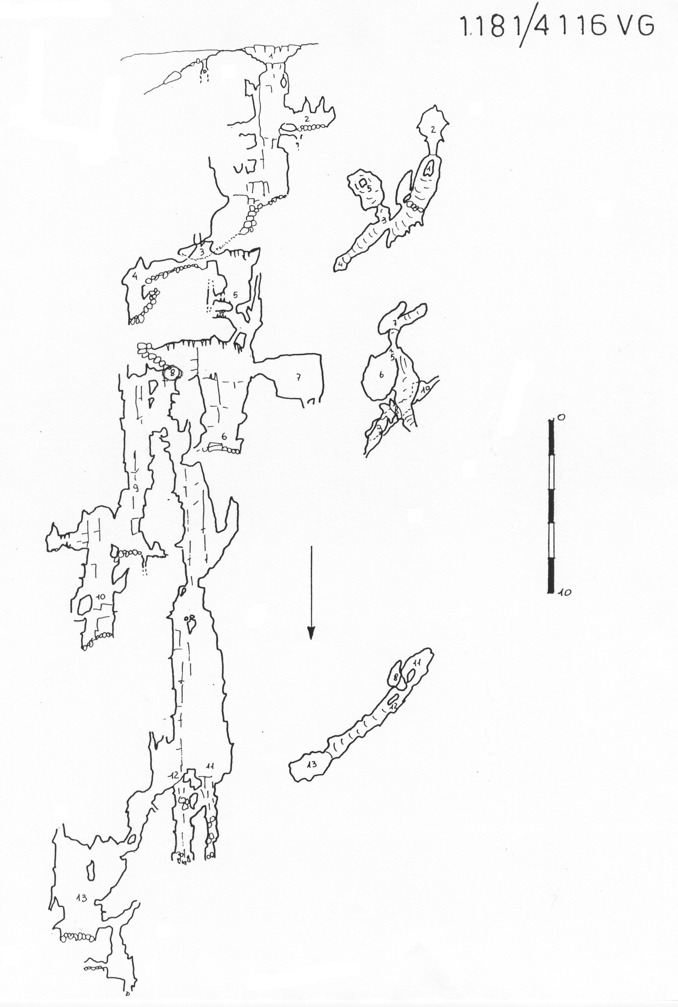 Dal pozzo di accesso si scende lungo una china detritica; a destra un pertugio immette in un basso ambiente che da una parte finisce in un cunicolo in discesa, interrotto da un pozzetto, e dall'altra in una piccola sala, al cui fondo un passaggio stretto dà su di un pozzo profondo una decina di metri, a metà del quale una finestra dà su un passaggio (punto 8 nel rilievo), aperto con scavi, sotto il quale la cavità prosegue con una serie di pozzi, che in parte mostrano segni di corrosione; i pozzi a NE terminano dopo una decina di metri, mentre quelli a SW conducono ad un ripiano traforato (punto 11) sotto il quale si scende ancora per qualche metro soltanto, oppure ci si cala verso NE lungo un cunicolo fortemente inclinato sino a pervenire ad una cavernetta riempita d'argilla; da qui si procede ancora per qualche metro sino ad uno slargo, sotto il quale è stato stimato che la grotta continua ancora per parecchi metri. I lavori si sono fermati su un passaggio stretto oltre il quale la cavità dovrebbe proseguire per almeno altri 15-20m.