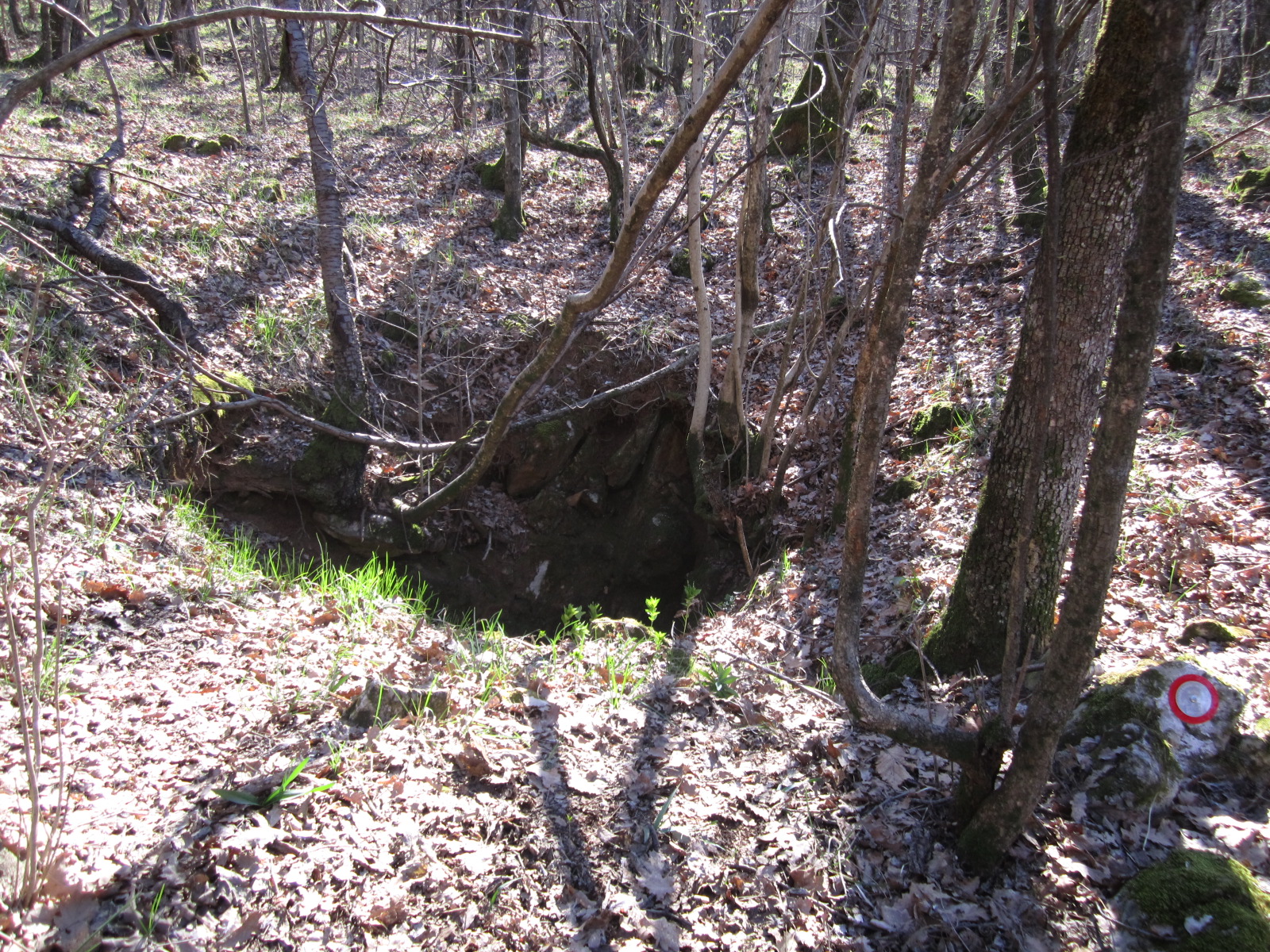 la grotta si apre sul bordo superiore di una spaziosa dolina ad una sessantina di metri a destra del sentiero che sale da Sagrado verso il Lanaro.