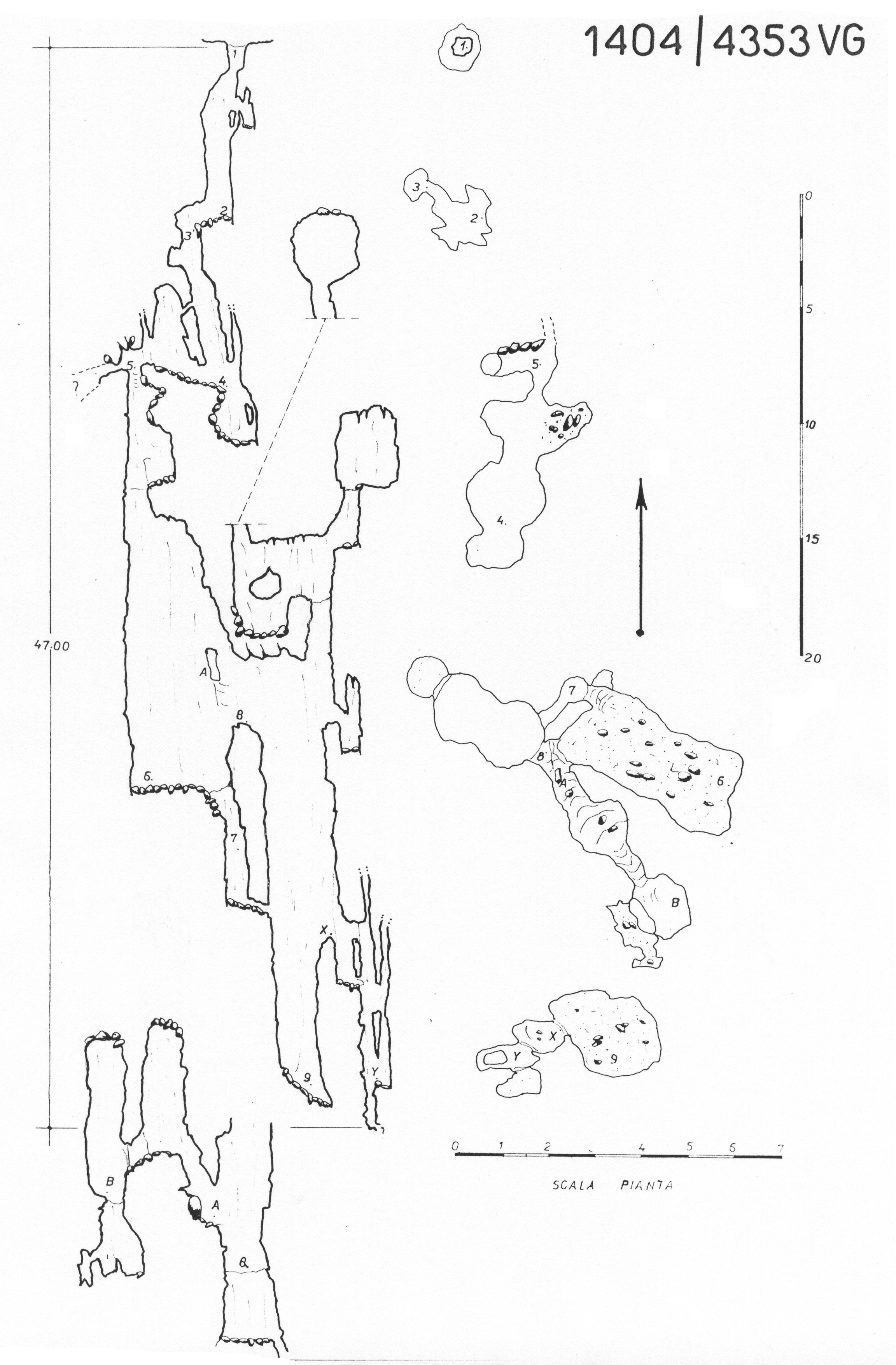 Circa a metà pozzo cieco (8-9) si apre una finestra (X) che dà adito ad una serie di strettissimi pozzetti in frattura e, nel punto più profondo, una fessura impraticabile impedisce di proseguire ulteriormente.