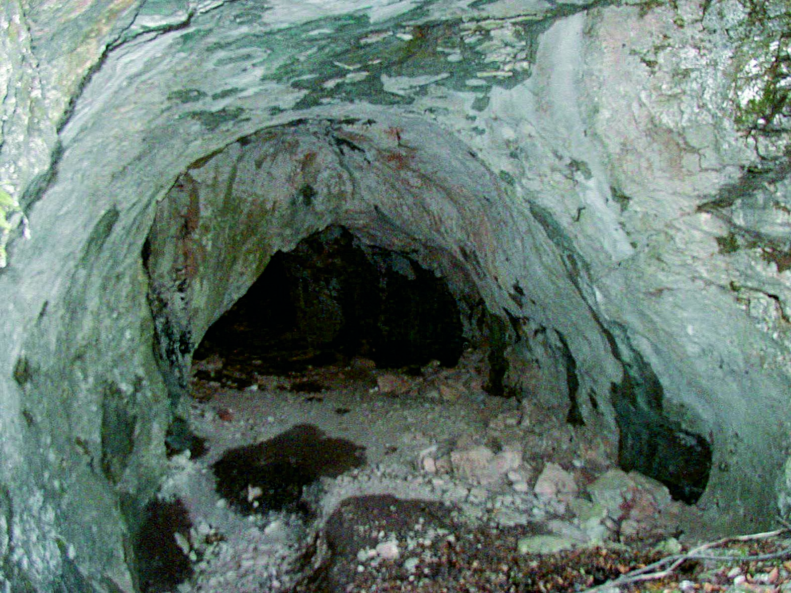 Un tempo la cavità non superava i 12m di lunghezza, ma durante la prima guerra mondiale la parete terminale venne sfondata e fu aperto un altro ingresso; questa parte dev'essere stata svuotata da un imponente ammasso di detriti ed argille che la intasavano, mentre verso Ovest fu scavata una galleria di 8m, interamente artificiale. Nella zona mediana della caverna, la risalita della parete Sud-Est, conduce in un vano in salita che porta al breve pozzo ostruito da pietrame.