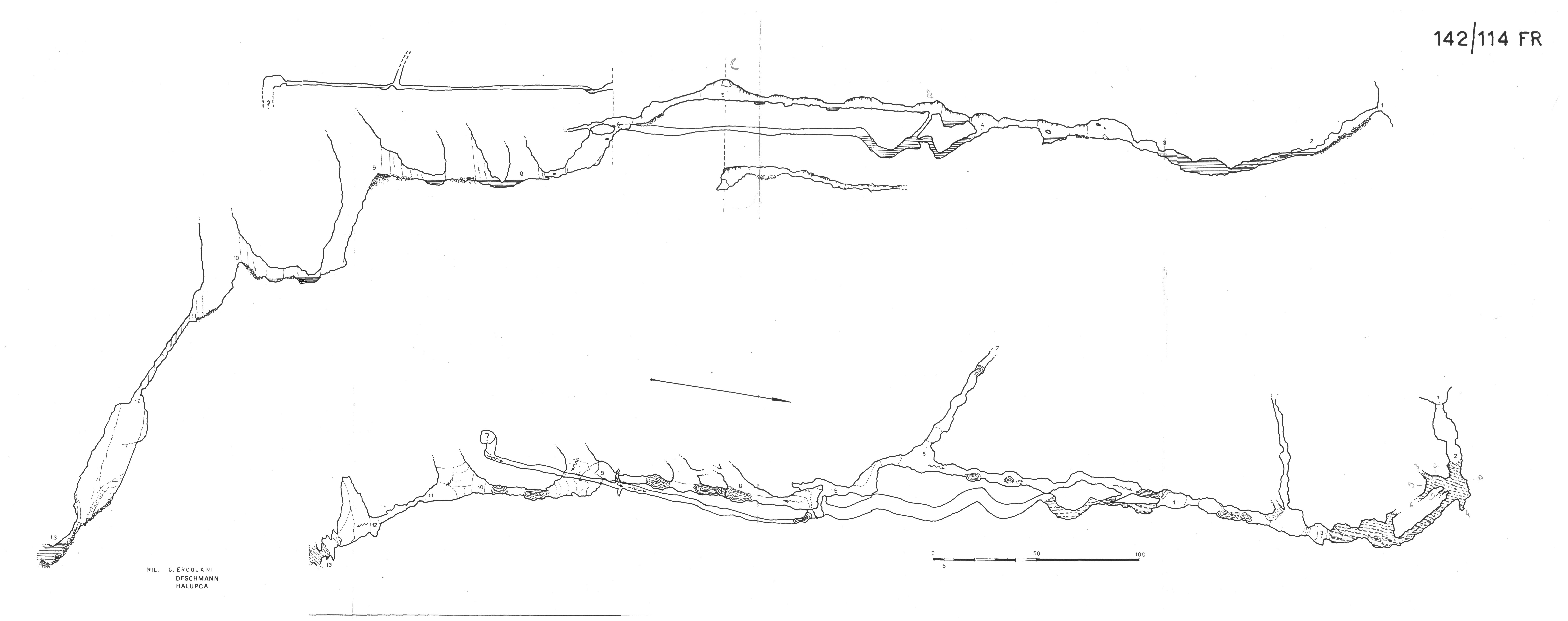Lungo questa galleria (dal punto 5 al punto 9), sono frequenti i sedimenti fangosi sulle pareti ed i depositi alluvionali nei tratti in salita verso l'esterno. Sia la prima (dal punto 2 al punto 5) che la seconda galleria (dal punto 5 al punto 9) sono percorse da modesti ruscelli, di direzione evidentemente opposta, i quali si gettano nei rispettivi sifoni.