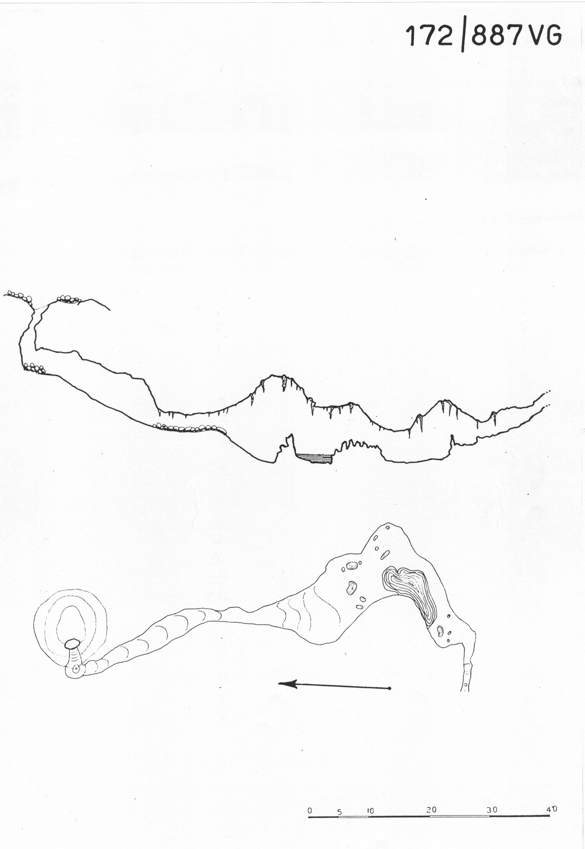 Con una corda lunga 10 m. si può facilmente discendere lungo le pareti del primo tratto della caverna, che ha presso a poco la forma d' un pozzo inclinato. Si arriva sopra un piccolo ammasso di pietre e da là si discende per una china lunga 37 m., la quale conduce in una sala abbastanza spaziosa e ricca di bellissime concrezioni calcaree. Il tratto che conduce dal pozzo iniziale a questa sala è un corridoio alto nel mezzo 5 m. e largo 2.50 m. mentre alla fine non ha che 1.80 m. di altezza. Questo corridoio corrisponde ad una fessura diaclassica; il terreno del medesimo è ricoperto da un grosso strato di humus nero che viene trasportato colà, attraverso l'entrata, dal bosco soprastante. La sala alla quale si accede, passando sopra una china incrostata di calcare, è lunga 45 m. e si suddivide in 3 scompartimenti, il primo dei quali ha le dimensioni di 13:11 m., il secondo 9:12.50 ed il terzo 9.50:5. Bellissime, grandi stalammiti con riflessi bianchi s'ergono ovunque; nel mezzo di due gruppi di stalammiti trovasi un bacino contenente dell'acqua limpida e fresca (12°C). Qui rinvenni alcuni esemplari della Bathyssia Khevenhülleri Miller.