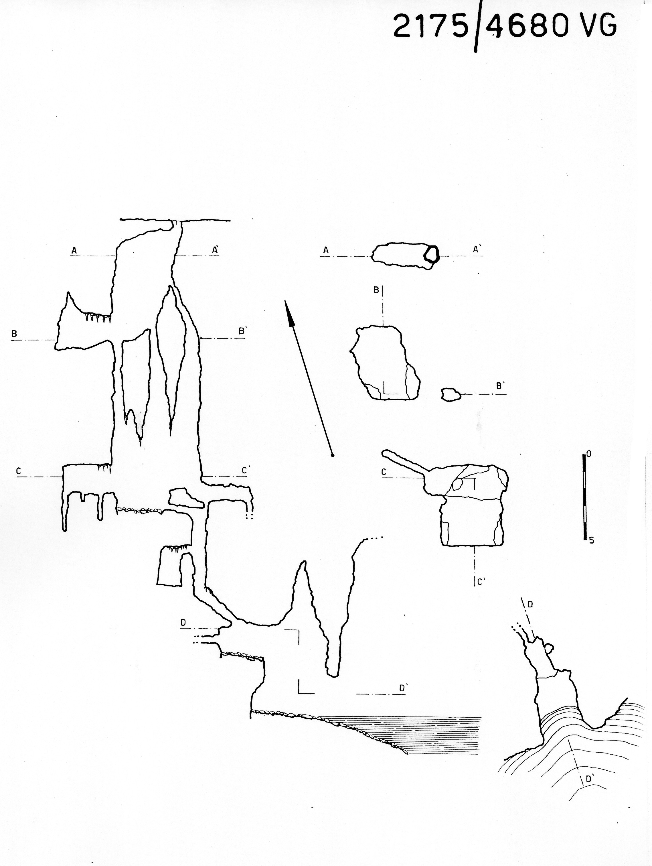 Nel centro della parte settentrionale della caverna, sormontato da macigni uniti da uno spesso strato di calcite, uno stretto pertugio dal quale esce una sensibile corrente d'aria, reso accessibile dopo un lungo e faticoso lavoro di scavo, conduce ulteriormente in profondità.