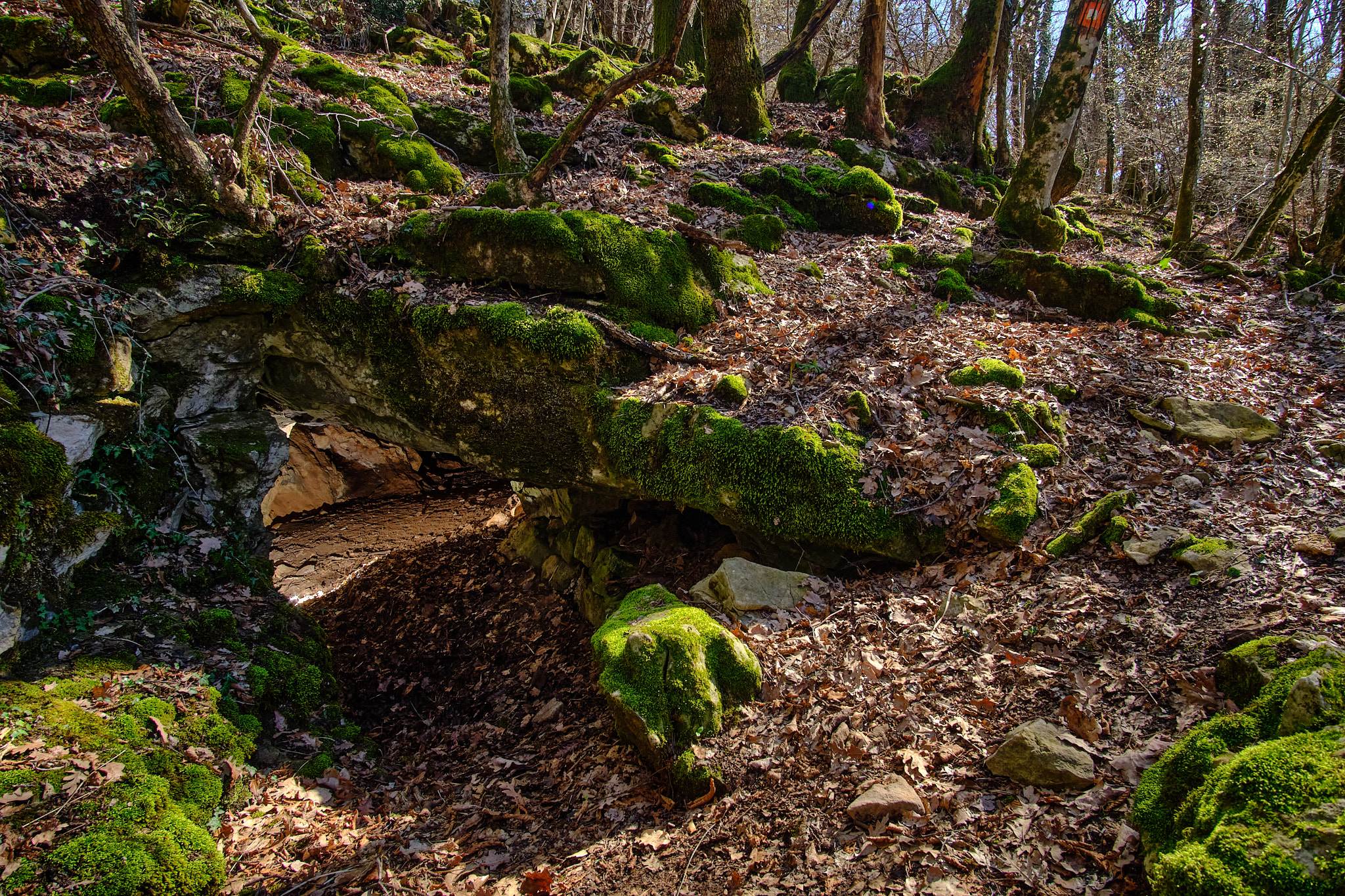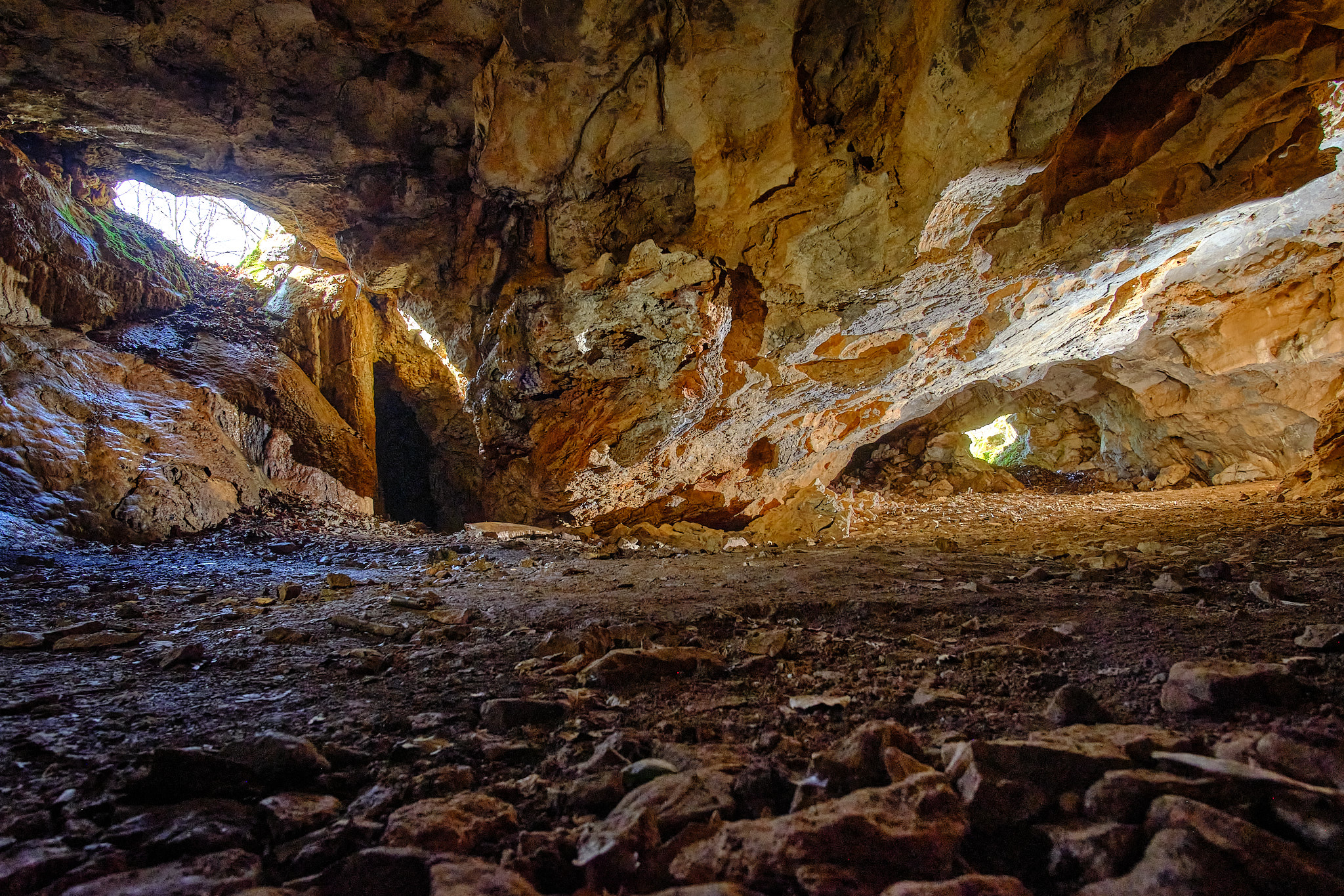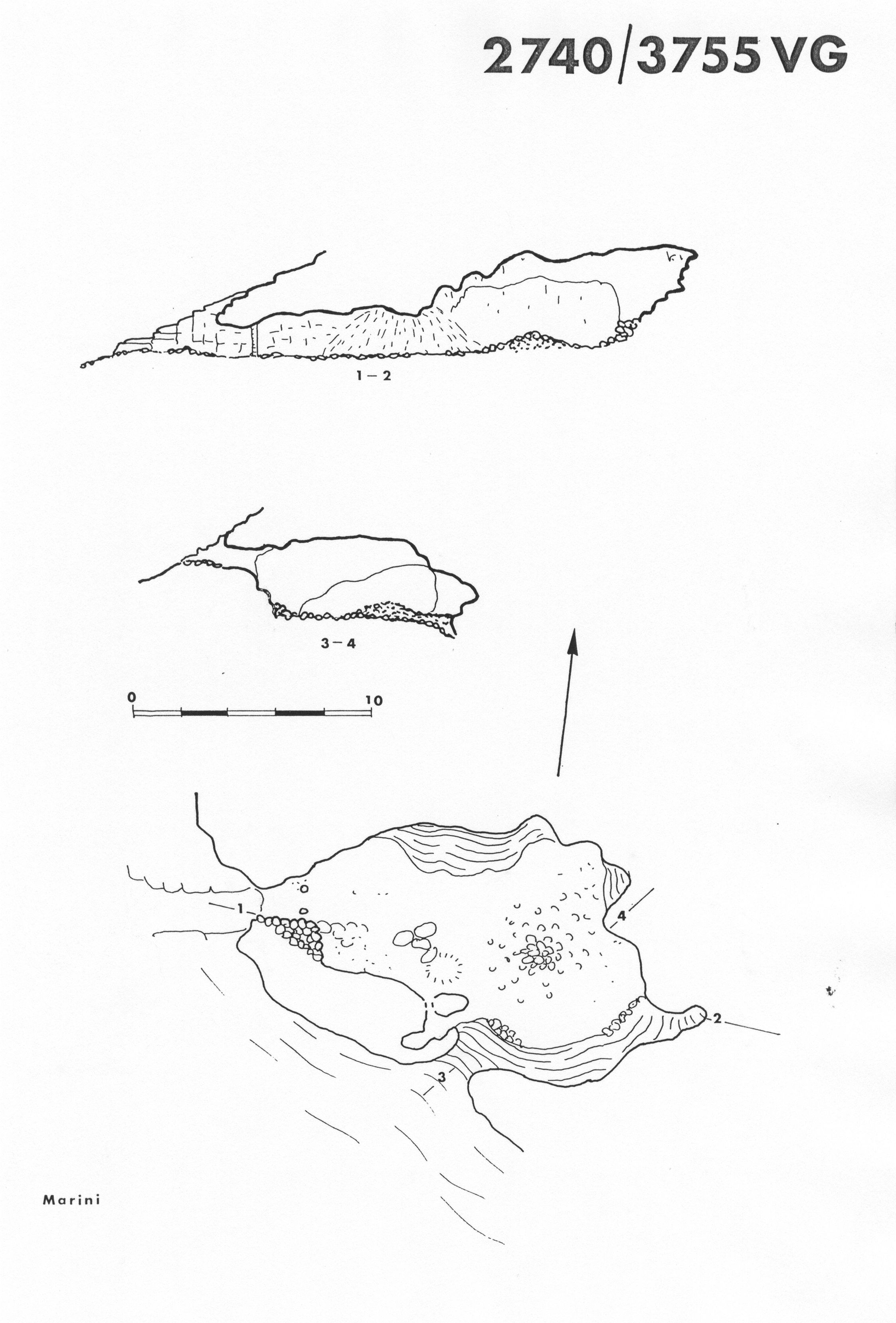 La caverna lunga 18 metri e larga 10 può essere facilmente visitata accedendo dall'ingresso 1. L'altro ingresso è costituito da uno scivolo di 2 metri circa.