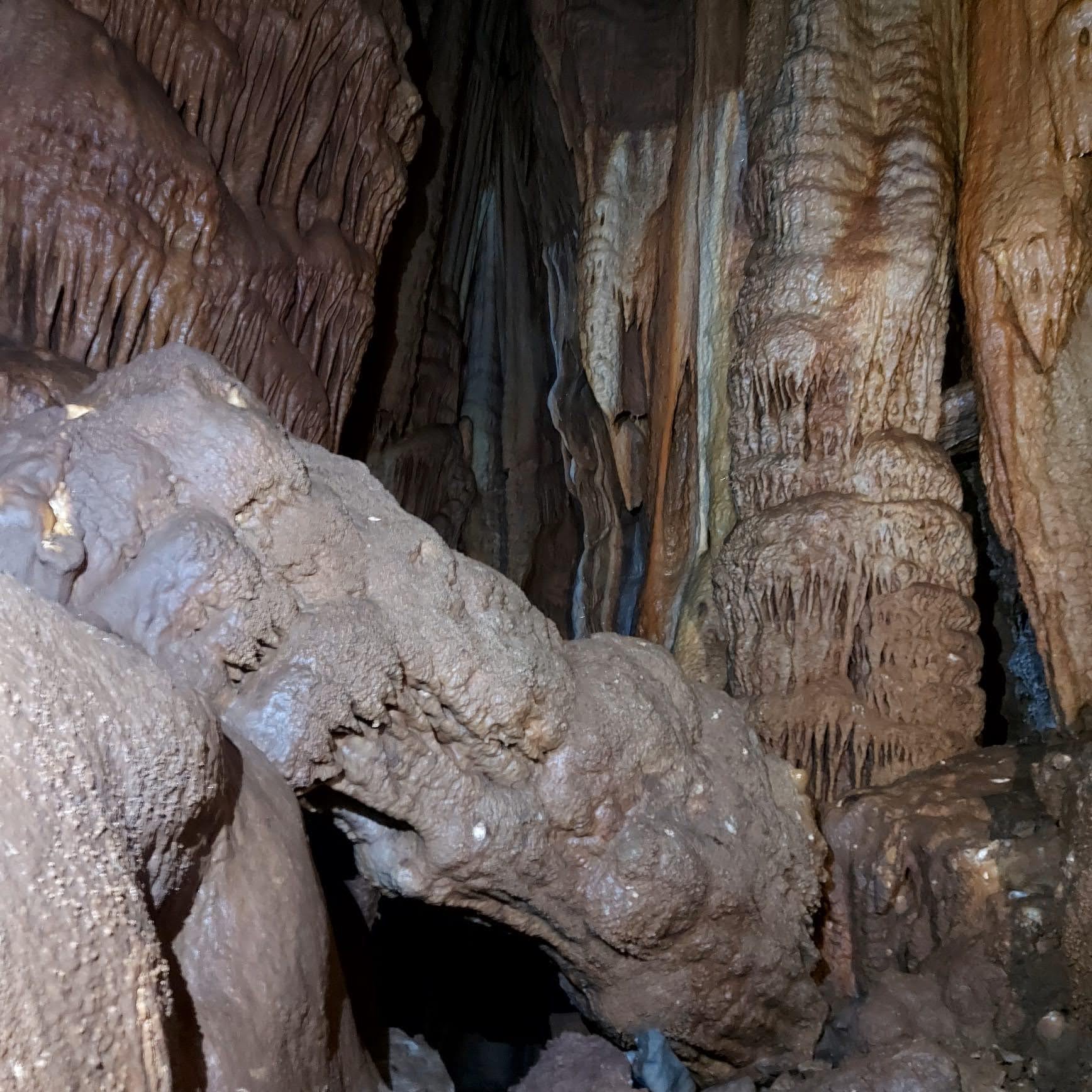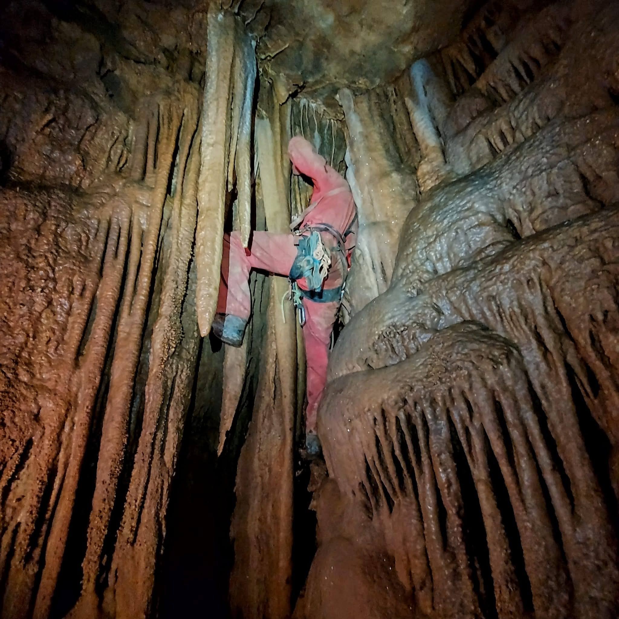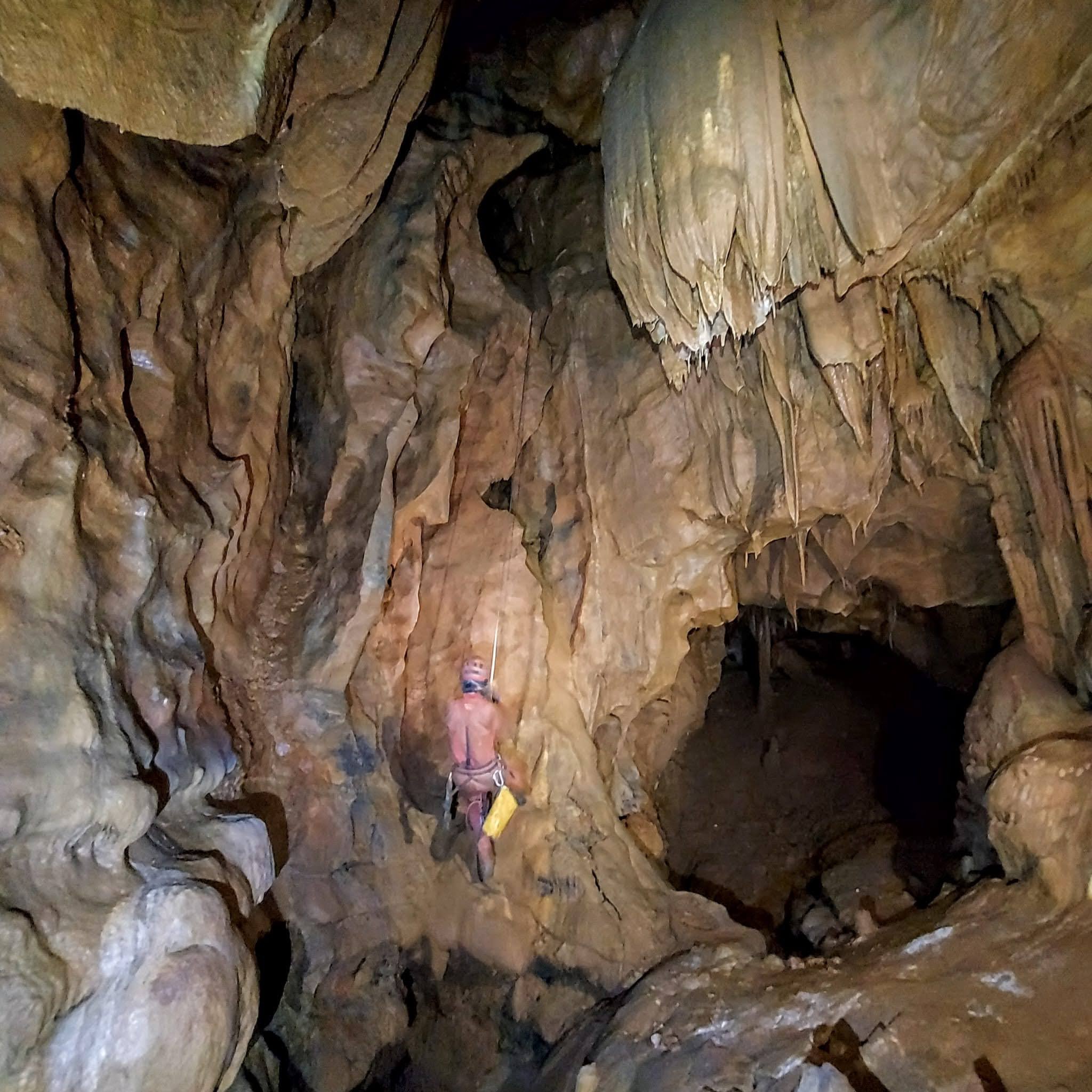 Sceso il primo saltino, si striscia lungo uno scivolo in terra e materiale organico in decomposizione, per giungere, attraverso una strettoia, al P12. Alla base del pozzo si giunge in una caverna, caratterizzata da colate calcitiche alte anche 15m e da enormi stalattiti ed esili cannule che pendono dal soffitto. Al centro della sala si trova un'imponente colonna del diametro di 3m.