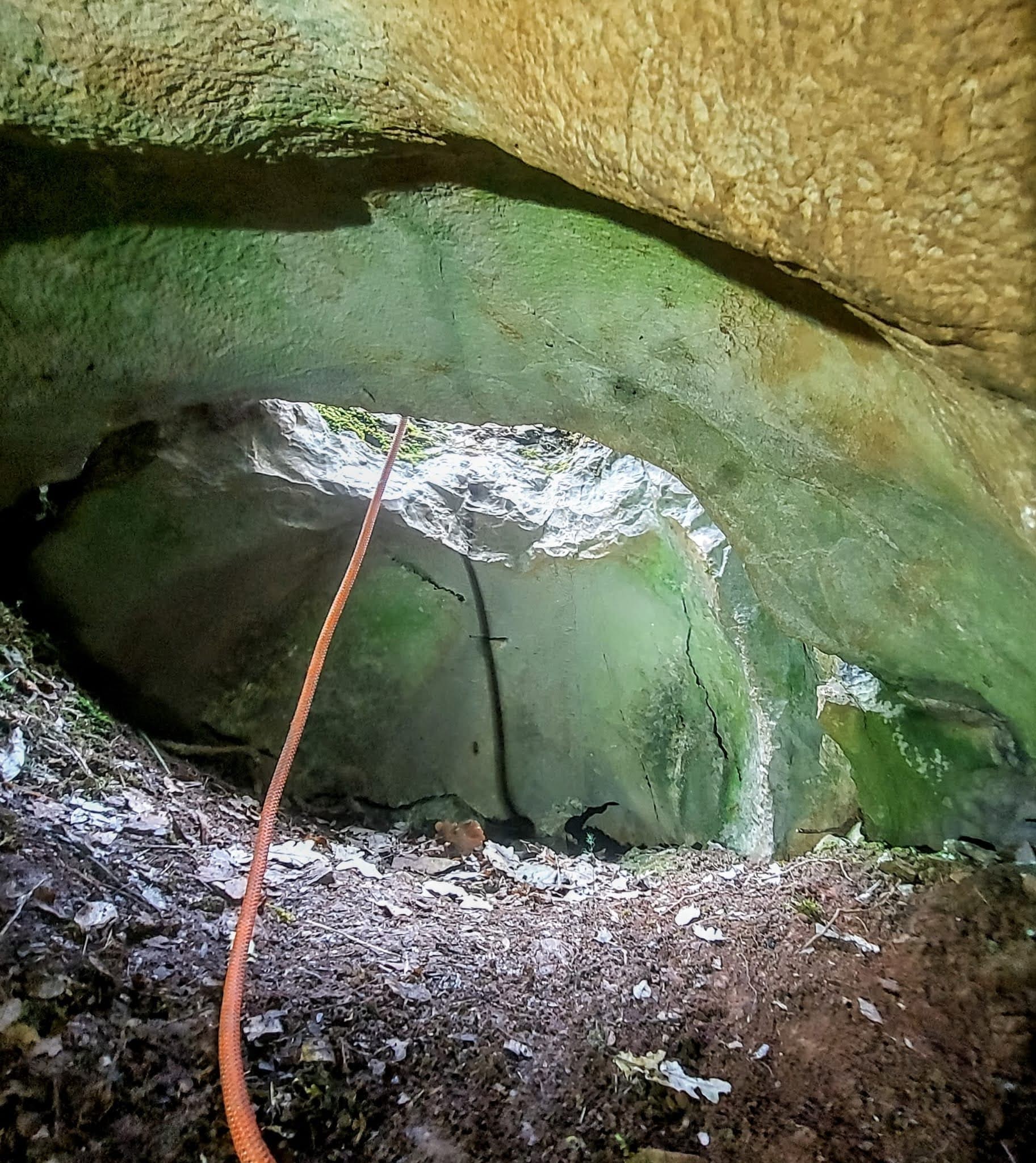Dalla caverna, in direzione NW, invece, lungo una china franosa, si giunge ad un saltino di 2,5m. Da qui, dopo pochi metri, si arriva ai piedi di un'enorme colata calcitica sopra la quale, all'altezza di 8m, si nota una finestra. Una volta raggiunta questa, si prosegue scendendo un saltino di 3m che dà accesso ad un angusto meandro con due diramazioni: una a fondo cieco, mentre l'altra scende in una condotta inclinata di 45°, lunga 8m. Si arriva quindi in una cavernetta ben concrezionata, si scende il P12 e si giunge ad una caverna ampia 16 X 8m. Qui, verso E, s'incontra un pozzetto di 2,5m, sul fondo del quale si può proseguire ancora per 7m incontrando però, in breve, un tappo d'argilla.