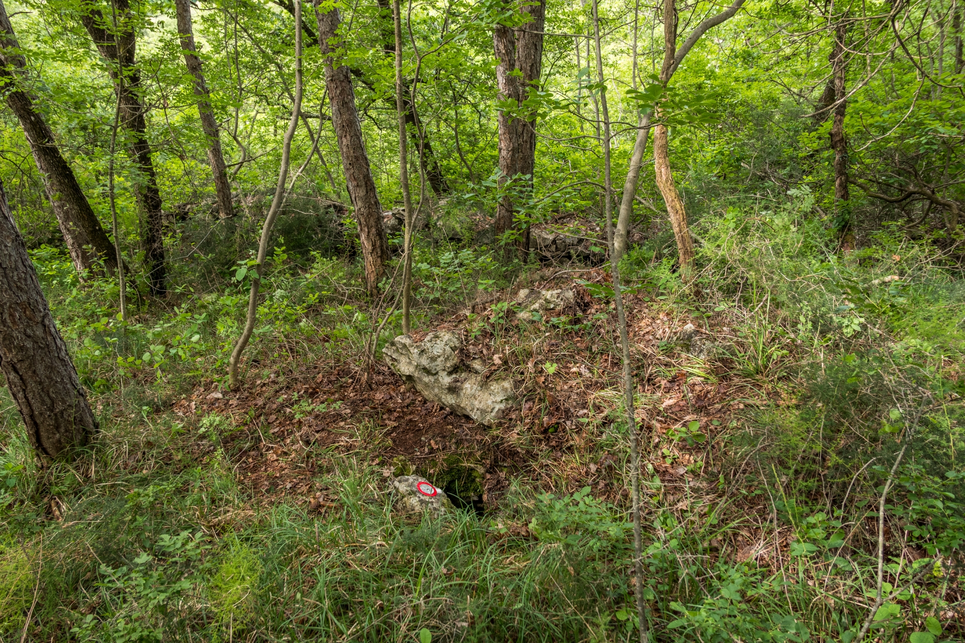 La cavità si apre ai margini di una pineta, in prossimità di un muro a secco.