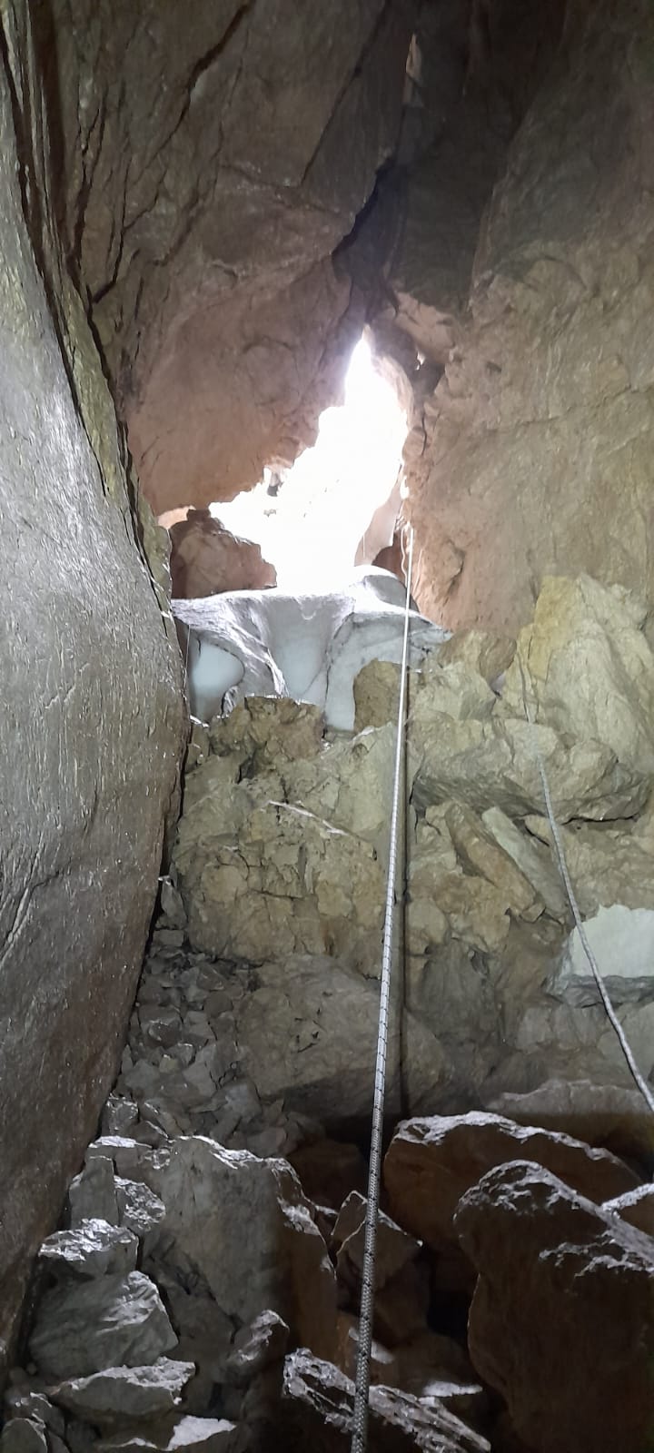 Un minuscolo pertugio che s'apre in un grosso cumulo di neve, al fondo di una depressione, permette di accedere ad un ampio stanzone con il fondo ricoperto da neve ed abbellito da colonne di ghiaccio; nel punto più profondo s'intravede, attraverso una stretta fessura, la naturale prosecuzione della cavità.