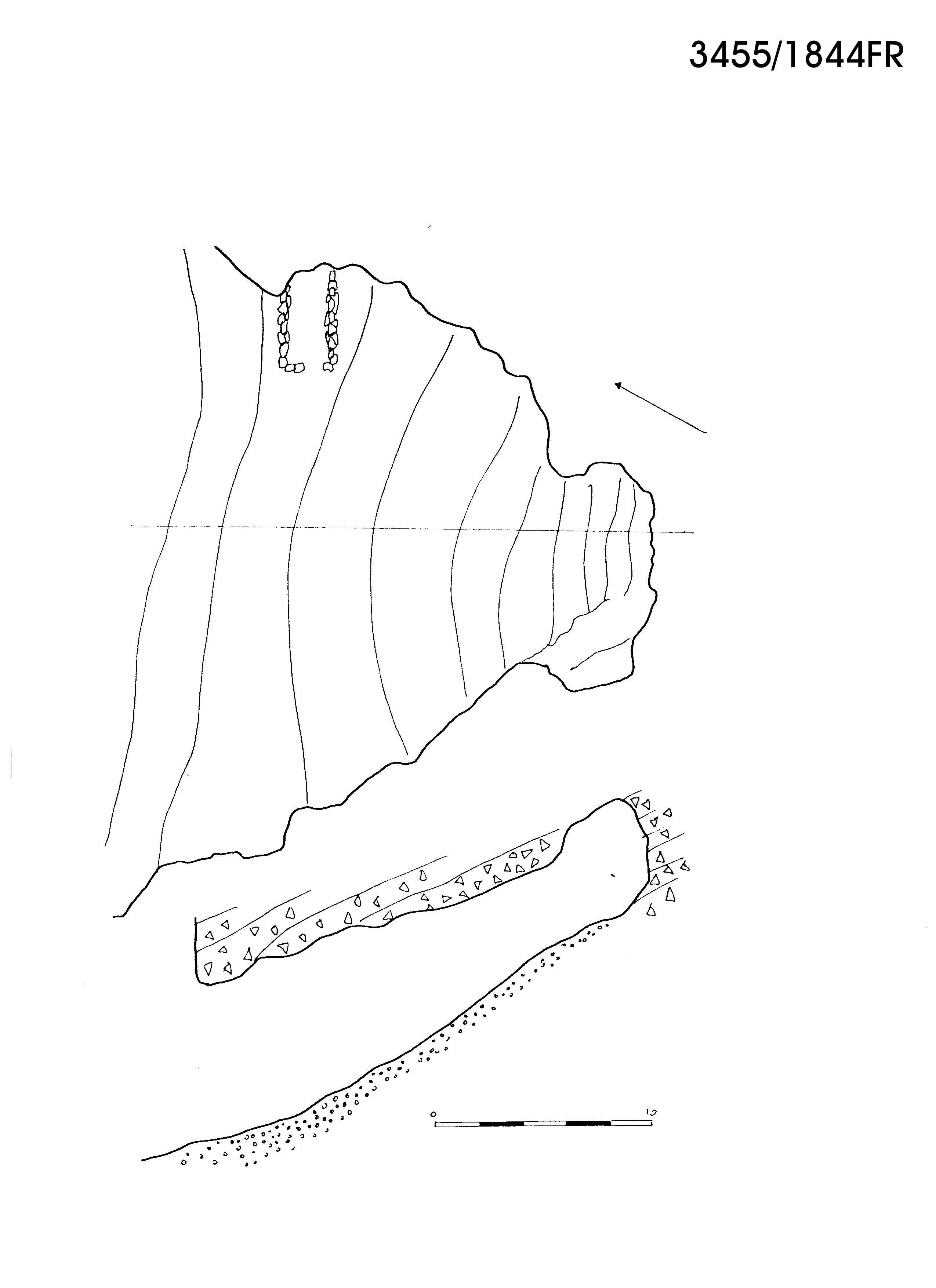 Si tratta di un riparo piuttosto ampio, a forma triangolare e con un angolo, quello che si addentra nella montagna, che tende ad allargarsi a campana. Qui cade dalla volta abbondante stillicidio che esplica una forte azione disgregatrice del soffitto. Il materiale di deposito e crollo, che scende ripido verso l'uscita, è abbondantissimo.