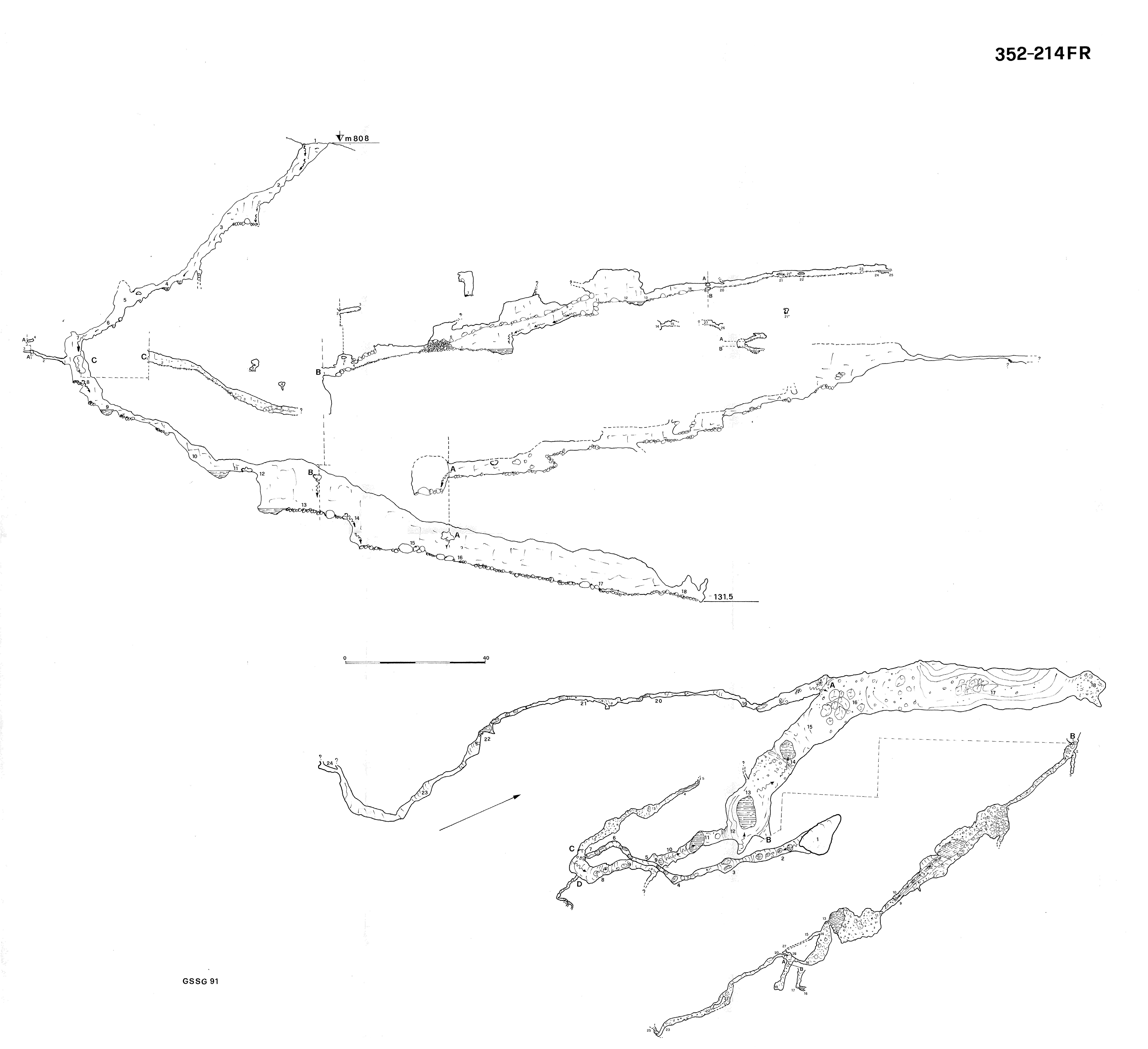 Il primo a sinistra conduce ad una pozza d'acqua, di là dalla quale il fango e le pietre ostruiscono il passaggio (punti B 17, 18). Il secondo (punti 14,15,27) dopo alcuni metri si trasforma in una fessura impraticabile, che si ricollega sia alla galleria principale, sia a quella terminale.