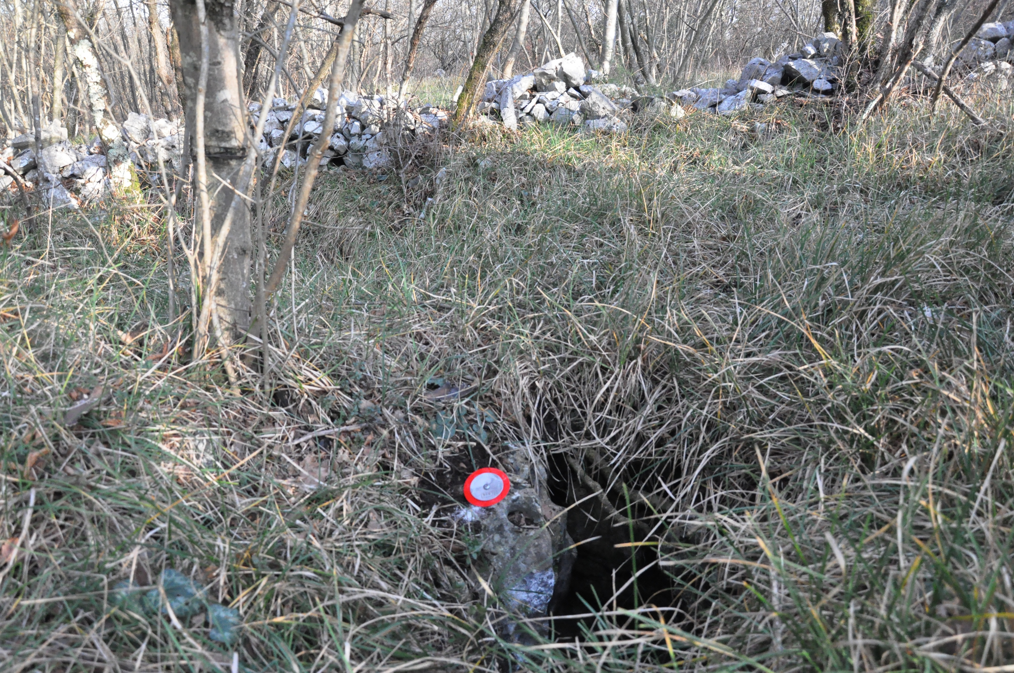 L'ingresso si trova vicino ad un cumulo di pietre eretto con il materiale detritico che riempiva quasi interamente il pozzetto d'accesso.