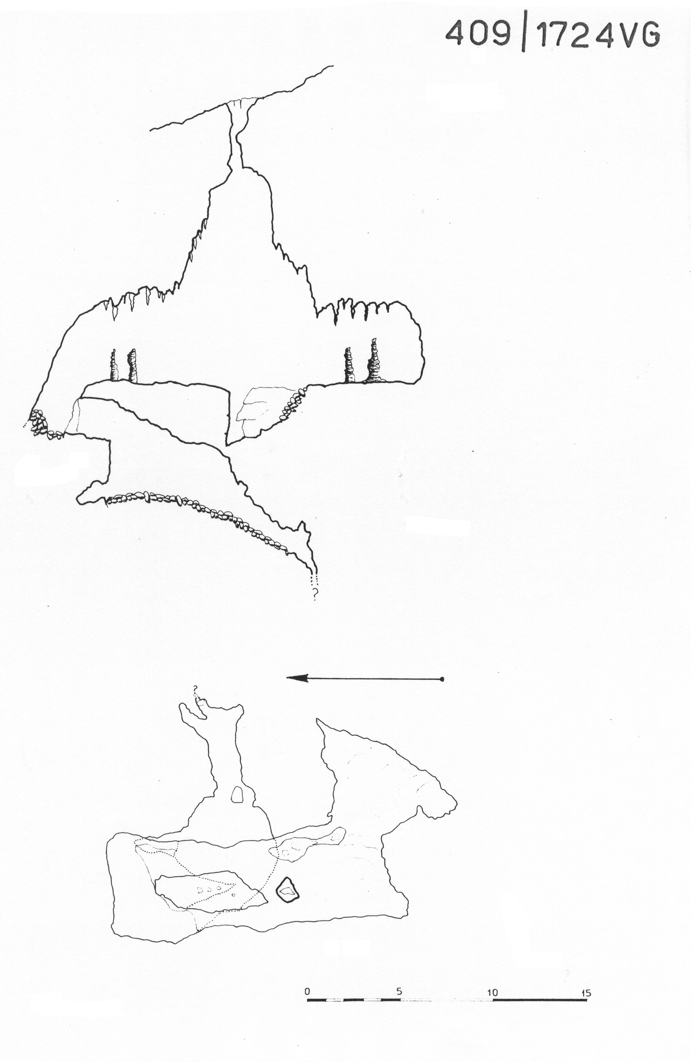 Oltre la strozzatura, ancora evidente, il pozzo si apre a campana, e la scala scende nel vuoto tra festoni di cortine satalattitiche e lunghissime stalattiti, in una pittoresca caverna, adorna di belle concrezioni, dalla quale si diparte una diramazione in discesa, occupata da massi ed argilla. Dall'imbocco della cavità esce quasi sempre una sensibile corrente d'aria, che in certe giornate d'inverno dà luogo ad una caratteristica fumata; l'origine del fenomeno può esser dovuta ad una relazione con la Grotta presso la 1724VG (1186/4086VG) che però, trovandosi in terreno militare, non è più accessibile.