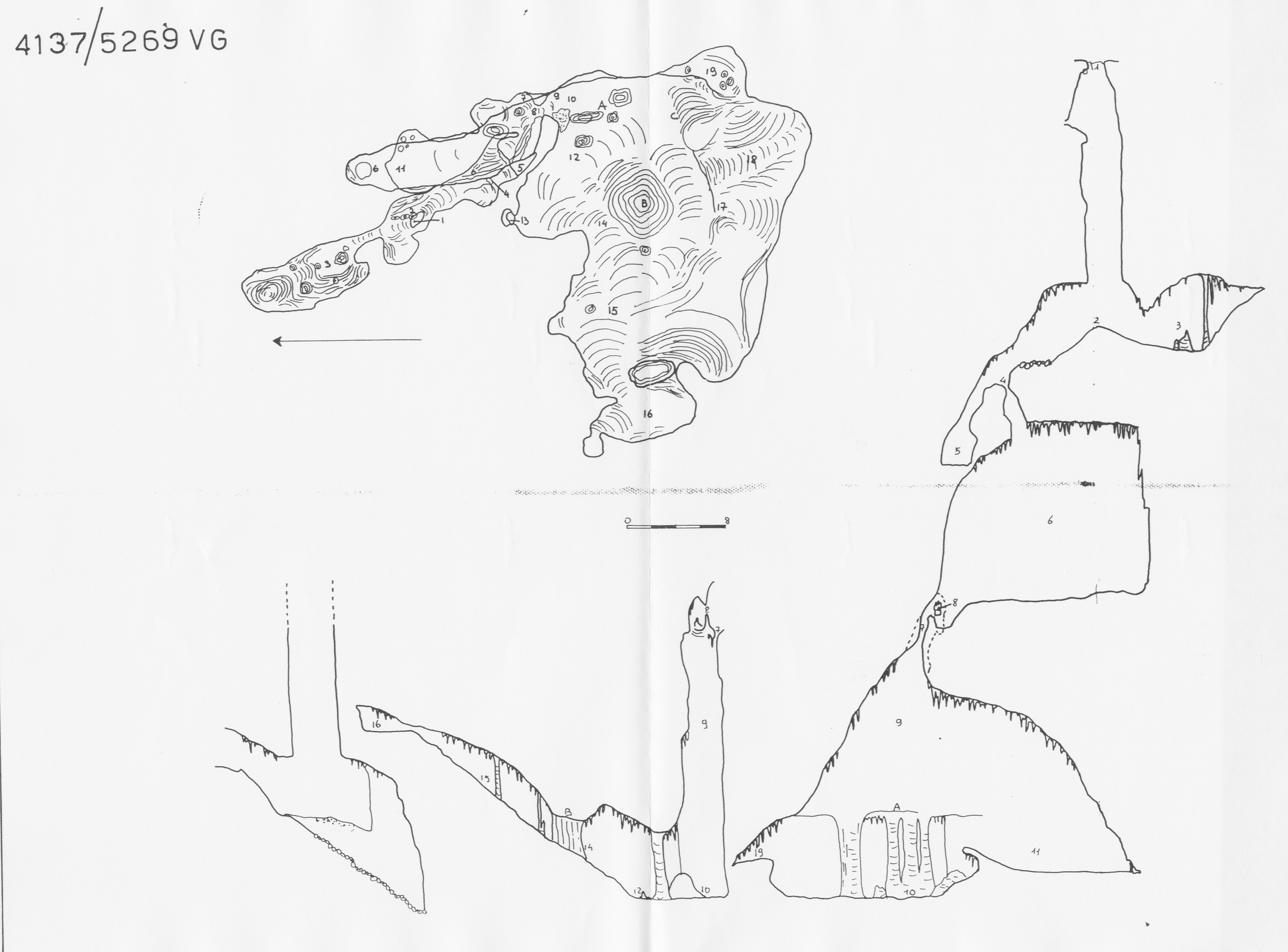 In direzione WQ si procede, invece, in salita, con una pendenza media di 35°, per circa 23m, fino a giungere ad una cavernetta occupata ad W da una frana di pietre ed argilla.