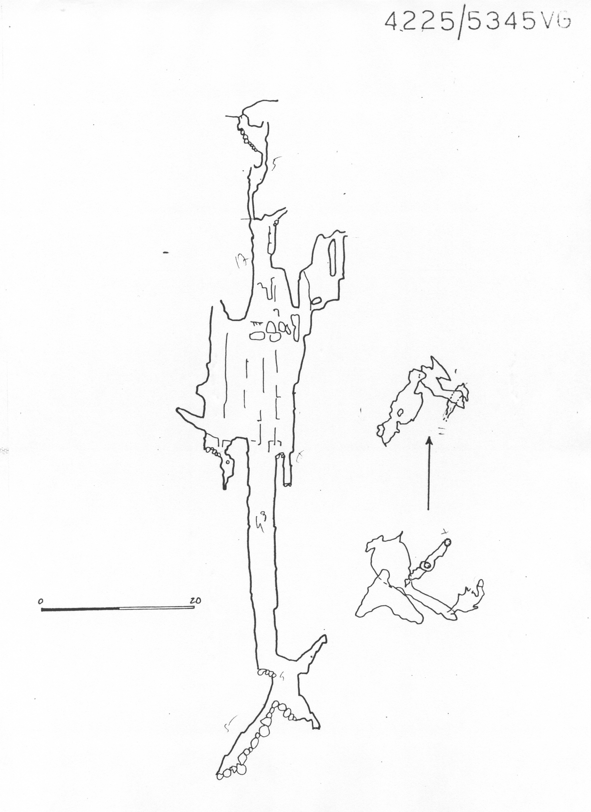 Uno stretto meandro porta al primo pozzo (P5); dalla base di questo, oltrepassata una strettoia, si prosegue scendendo un P17 caratterizzato dalla presenza di lame d'erosione. Questo termina su un ripiano formato da grossi massi incastrati tra le pareti; tra questi s'aprono più passaggi che danno sul pozzo successivo, un P49. Questo è interessato, nella sua prima parte, da slarghi laterali, con relativi ripiani, che terminano in piccoli pozzi (uno cieco e l'altro che prosegue con una fessura intransitabile).
