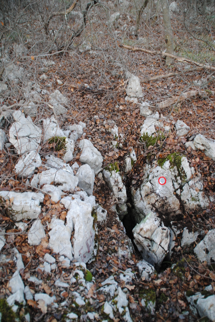 La cavità s'apre sul bordo di una pietraia.