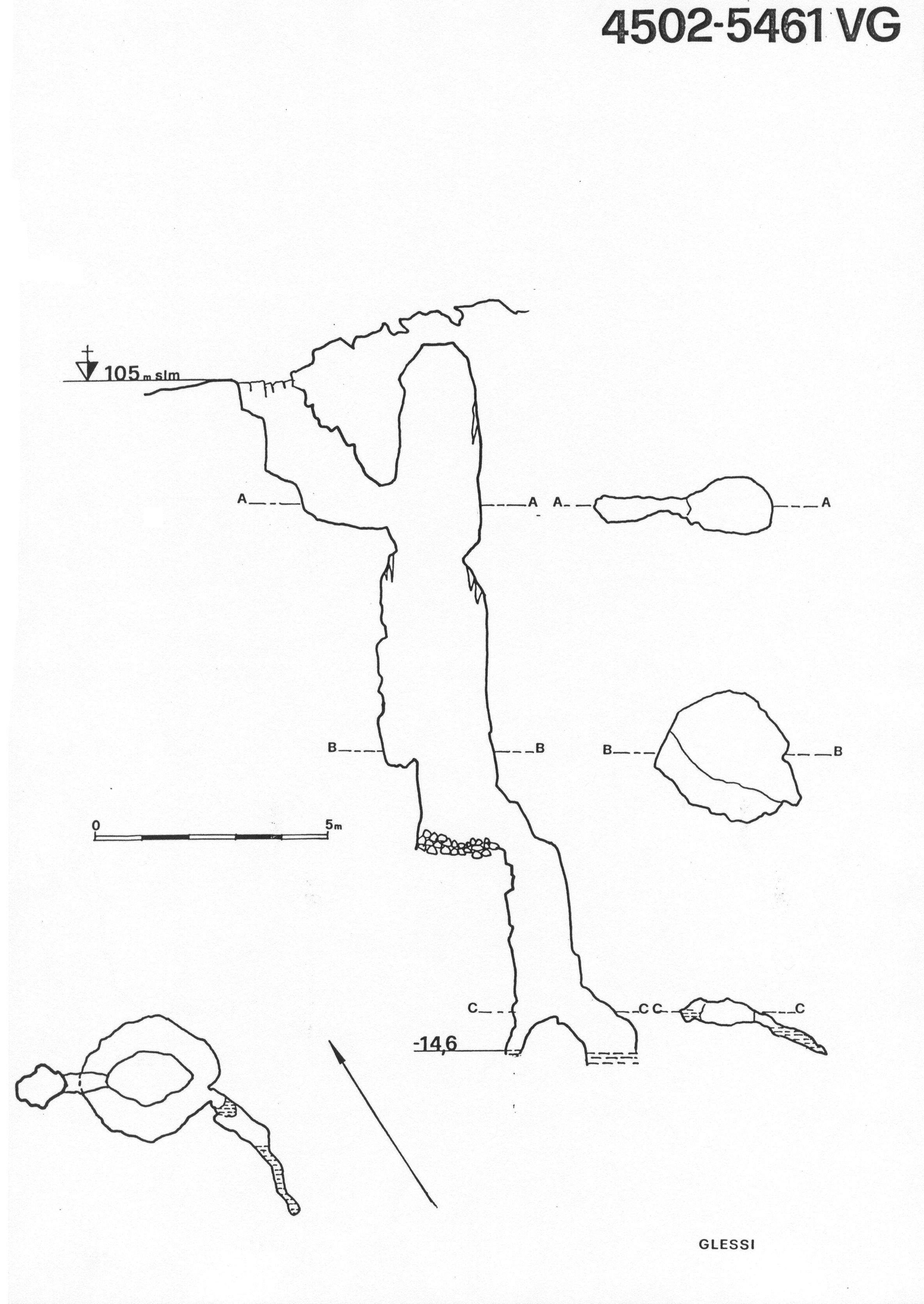Alla base del salto iniziale c'è una strettoia oltre la quale s'apre un P7 seguito subito da un P4; sul fondo di questo si trovano delle pozze d'acqua dovute allo stillicidio.