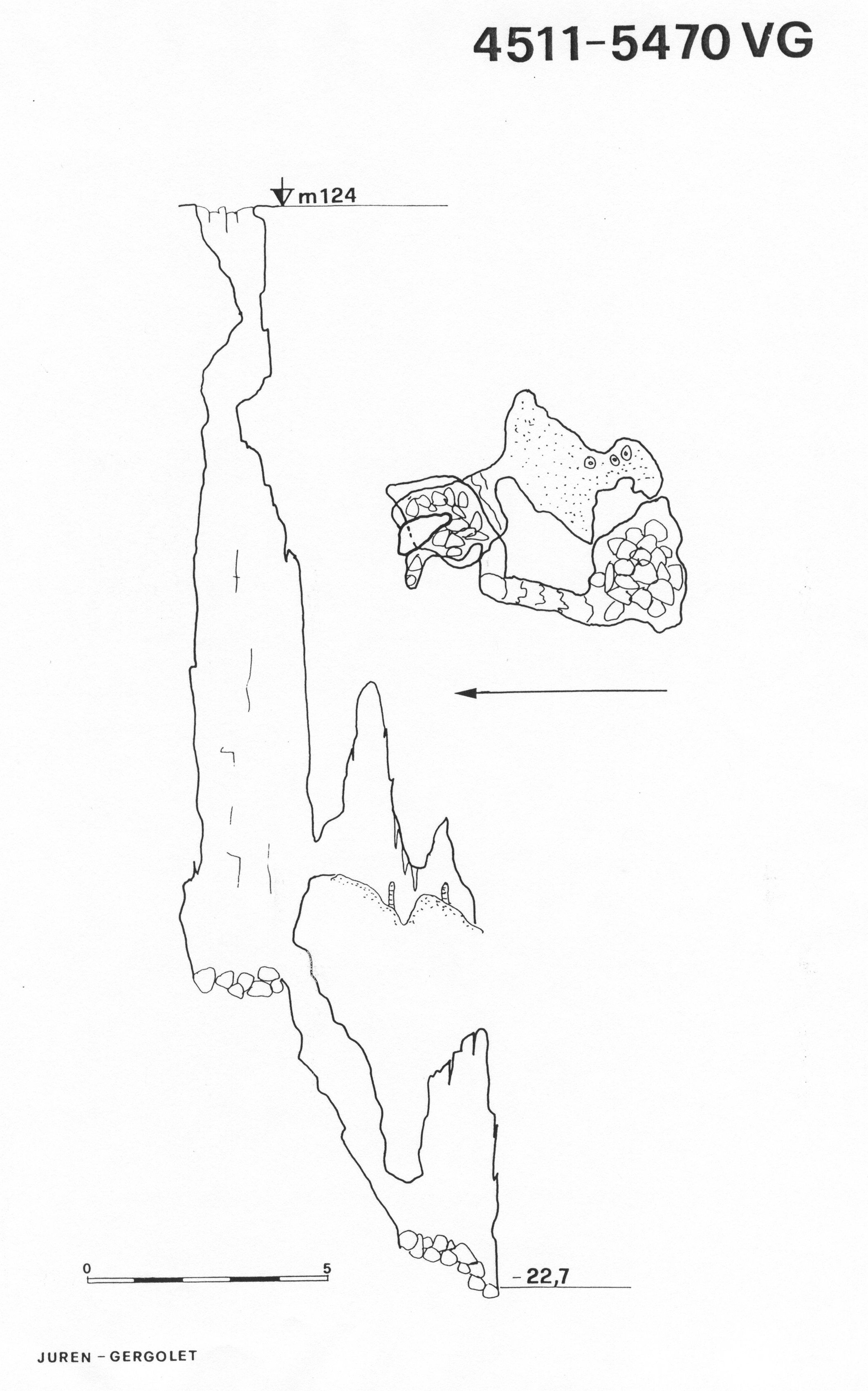 Dalla base del pozzo d'accesso, invece, s'apre l'imbocco di un cunicolo che dà accesso ad un P3,5 ricoperto totalmente da corallo di grotta. Sul fondo, un piccolo scivolo (P2,8) termina nella sala finale occupata da grossi massi. La saletta presenta anche un possibile proseguimento che, nel corso dell'esplorazione, non è stato approfondito.
