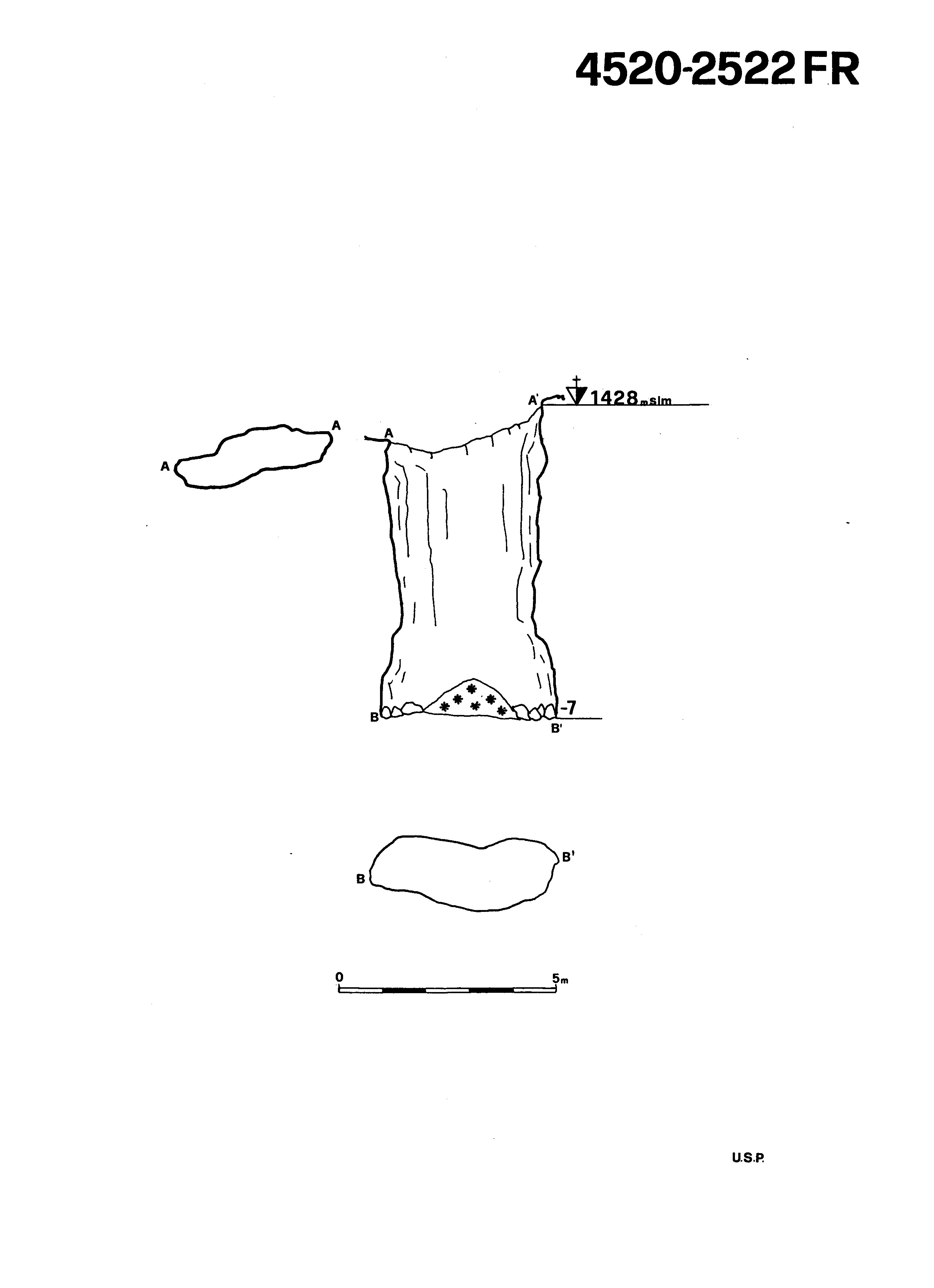 La cavità è costituita da un unico pozzo, profondo 7m, chiuso al fondo da massi e neve.