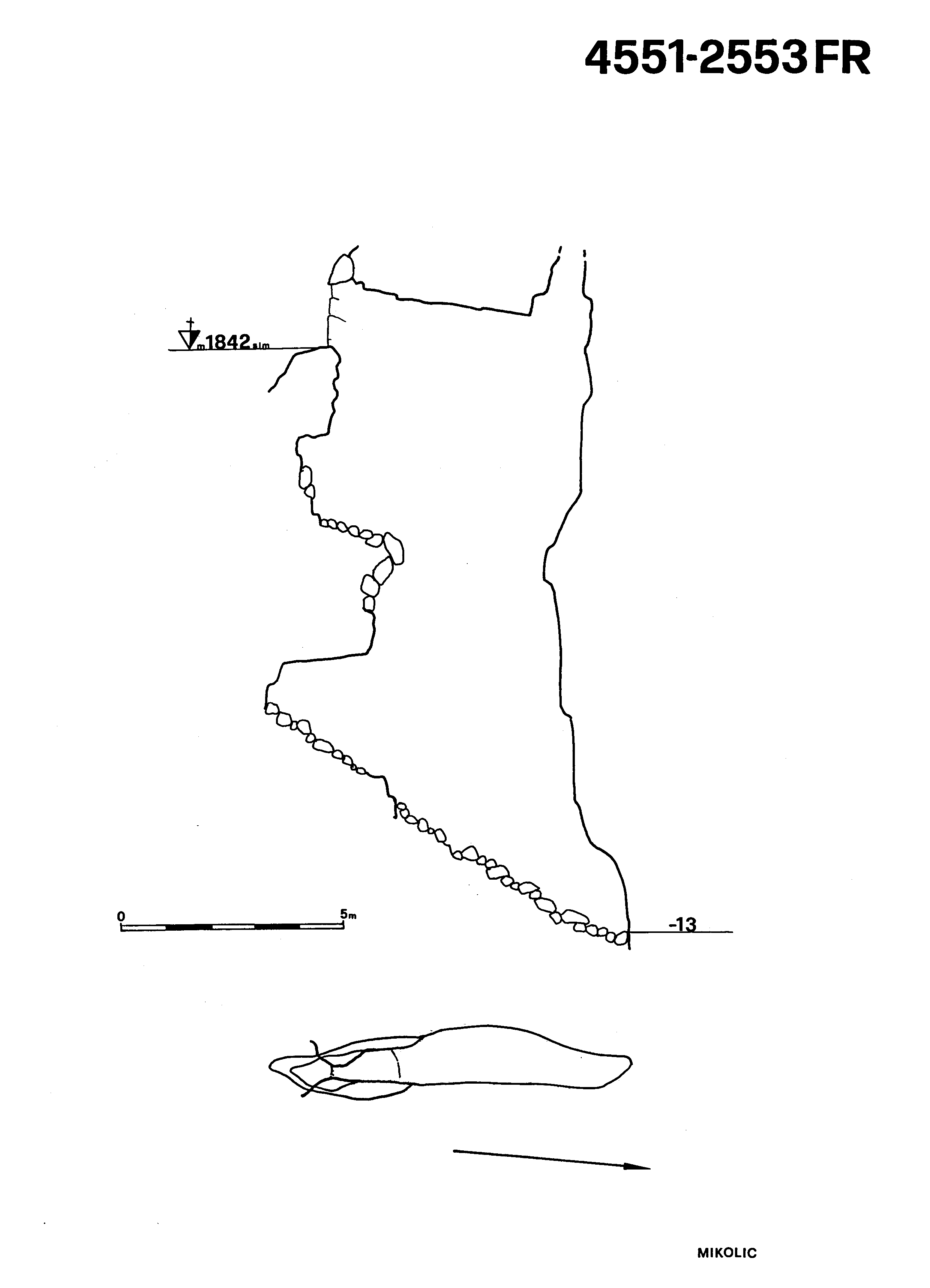 Superata la strettoia iniziale ci si trova sul lato S di un pozzo (ampio 6 X 1,5m) caratterizzato, a 4m di profondità, da un terrazzino costituito da massi in equilibrio instabile.