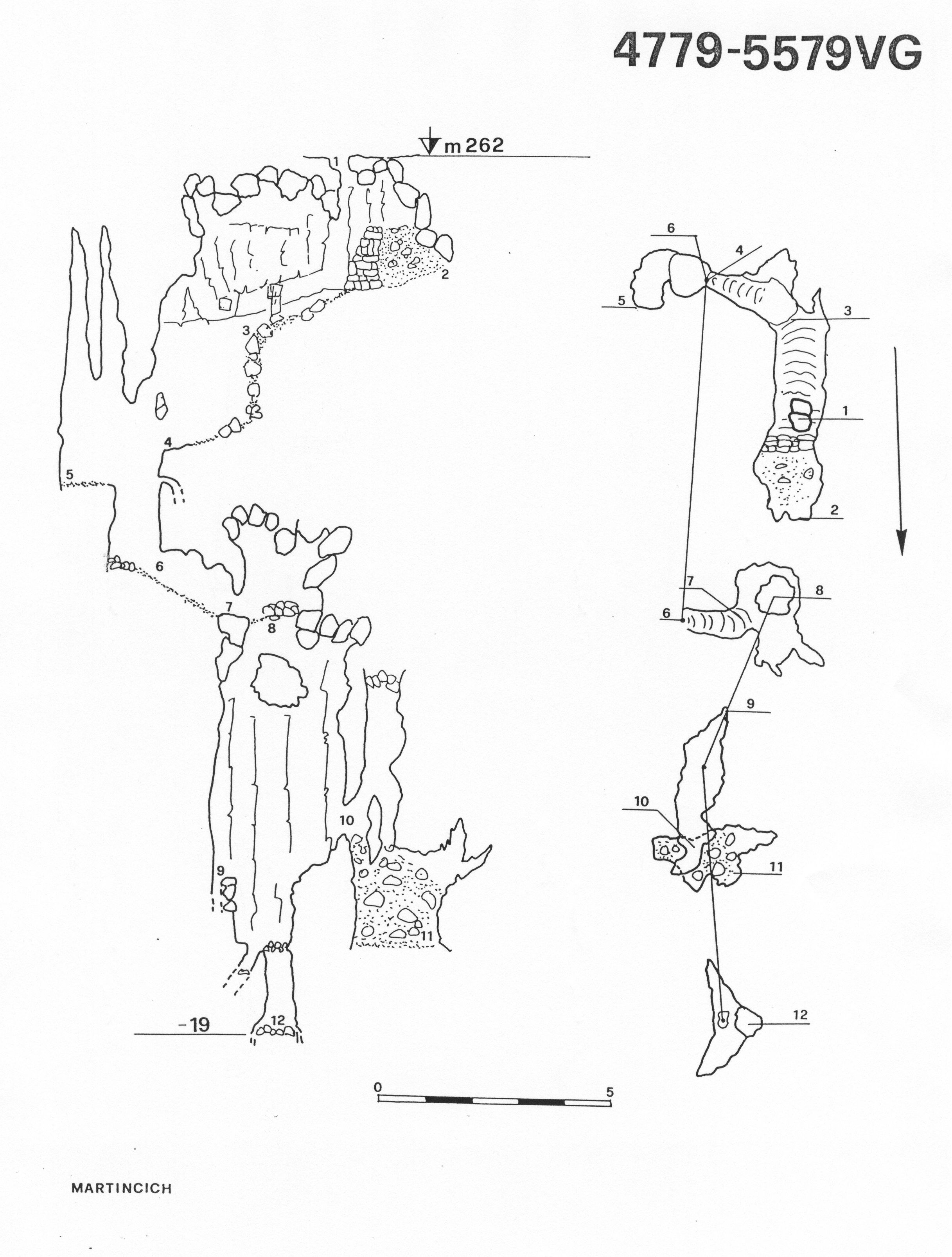 All'interno della cavità (punto 3 del rilievo) sono venuti alla luce diversi cocci preistorici che, forse, si trovano anche in altri punti del tratto iniziale della cavità.