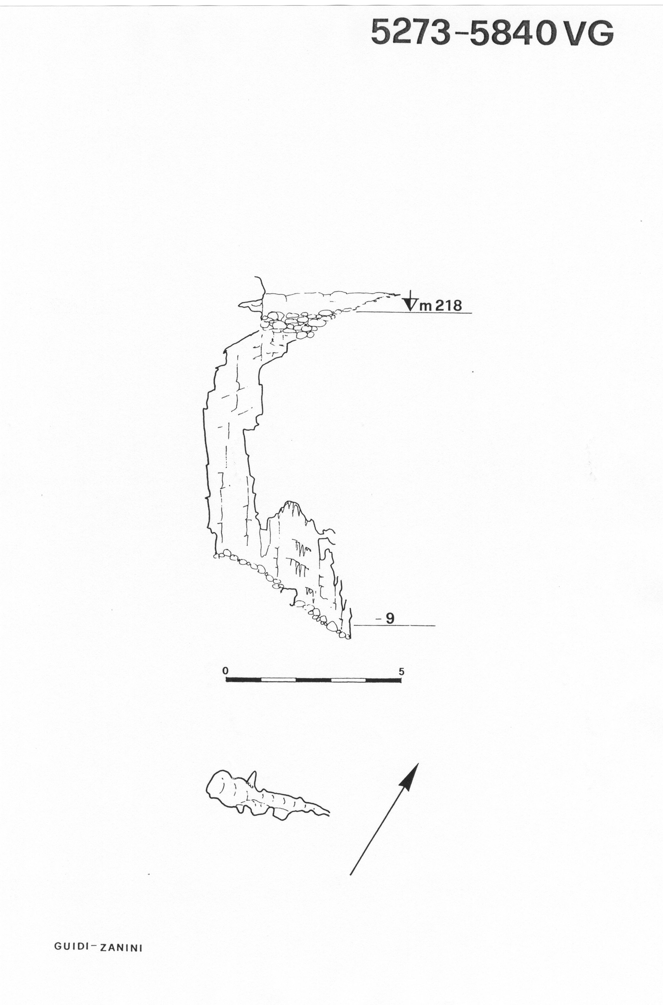 Alla base del pozzo d'accesso un basso pertugio immette in uno stretto vano verticale, concrezionato, dal fondo obliterato da massi e pietrame vario. Fra gli interstizi del punto più basso (p.3) i sassi talvolta cadono ancora per un paio di metri.