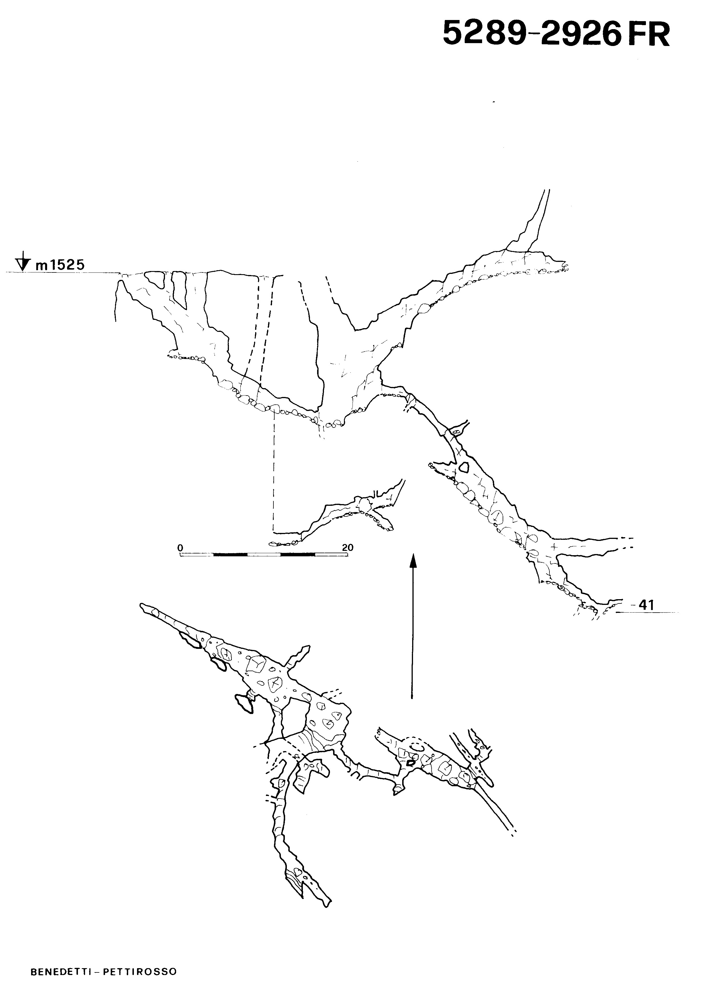 Si scende lungo un inclinatissimo scivolo (con vari camini comunicanti con l'esterno) per arrivare in una bassa caverna dalla quale si diparte una diramazione ascendente verso destra. Dopo un basso passaggio si giunge in una seconda caverna con un alto camino. Compiuta una risalita sulla parete Sud si intercettano prima un ramo discendente, che porta con dei salti e alcuni scivoli alla massima profondità, poi, con un'ulteriore risalita, ad un ramo ascendente che conduce ad un camino a +10m.