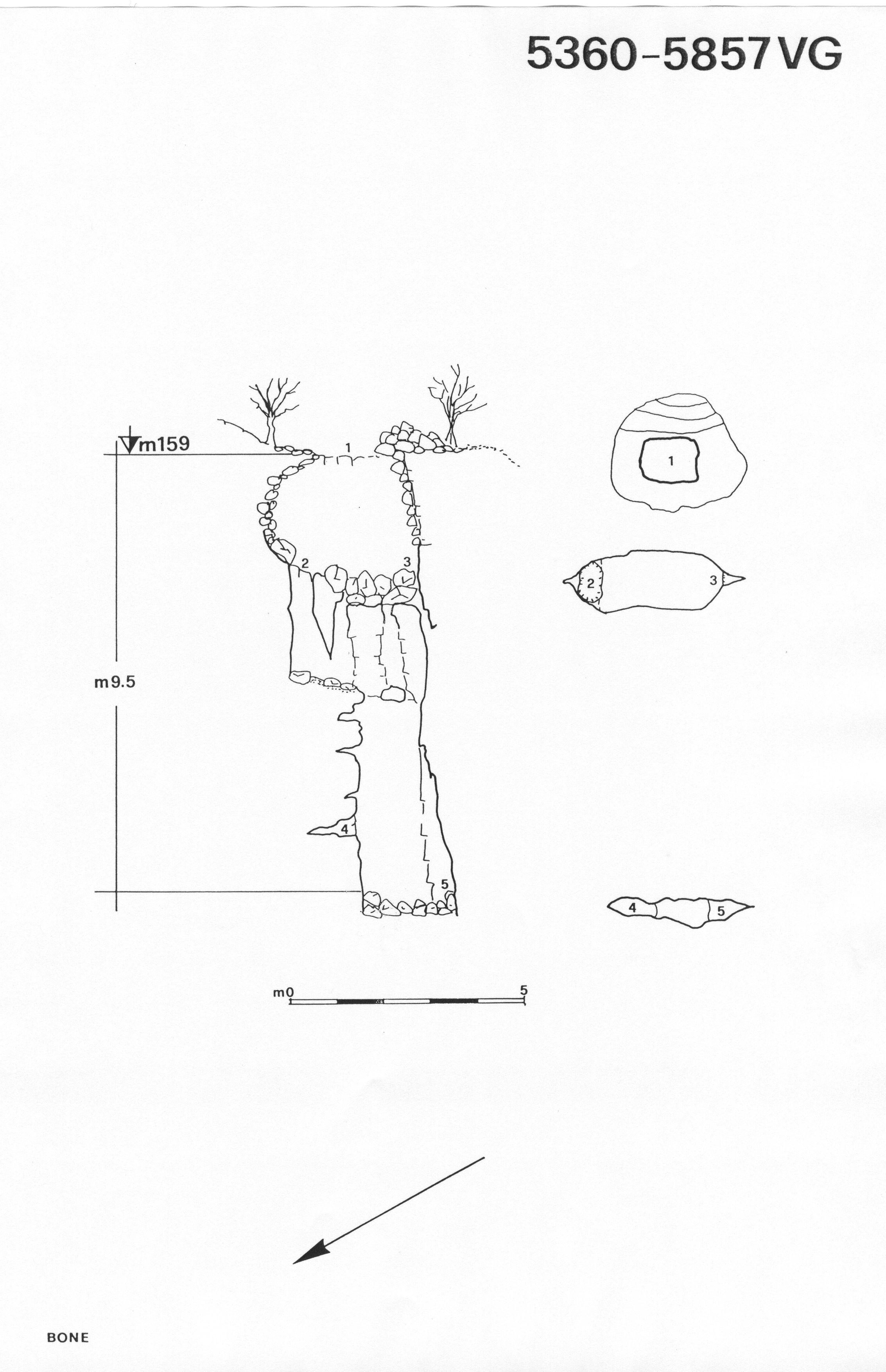 Un pozzetto piuttosto angusto ma agibile porta ad un secondo pozzetto in diaclasi, fortemente eroso ed infido, profondo appena 4 metri. Il fondo, strettissimo, è coperto da detriti che chiudono ogni ( improbabile) prosecuzione. In questo punto non si è notato alcun flusso d'aria, il che fa supporre che l'aria uscente dall' ingresso al momento della sua apertura provenga dai fianchi piuttosto franosi e ricchi di nicchiette della dolinetta prospicente.