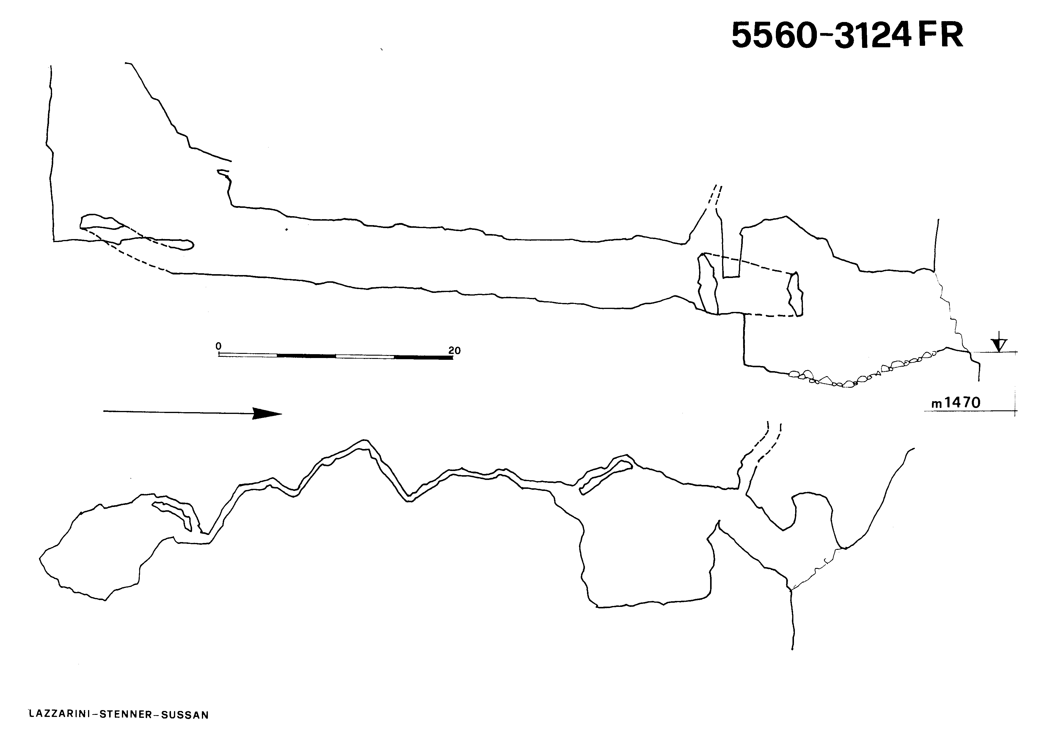 Dopo l'ingresso molto ampio e ventoso si risale per 5m con un'agevole arrampicata fino ad arrivare all'imbocco dell'evidente meandro che, in modo non troppo agevole, porta dopo 40m alla base di un'altro salto, valutato 20m non ancora risalito.