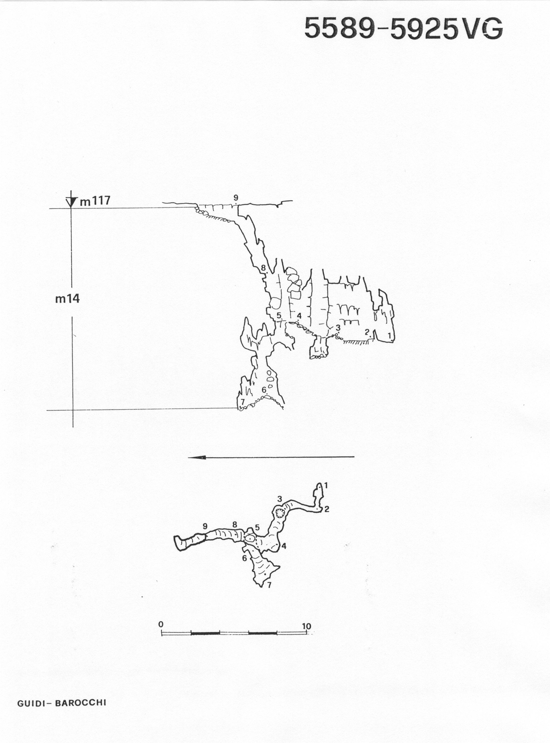 Dal punto 5 del rilievo, superati un saltino ed un restringimento, si previene al pozzo interno in cui ad una parte (W) riccamente concrezionata si contrappone l'altro lato (NE) estremamente eroso.
