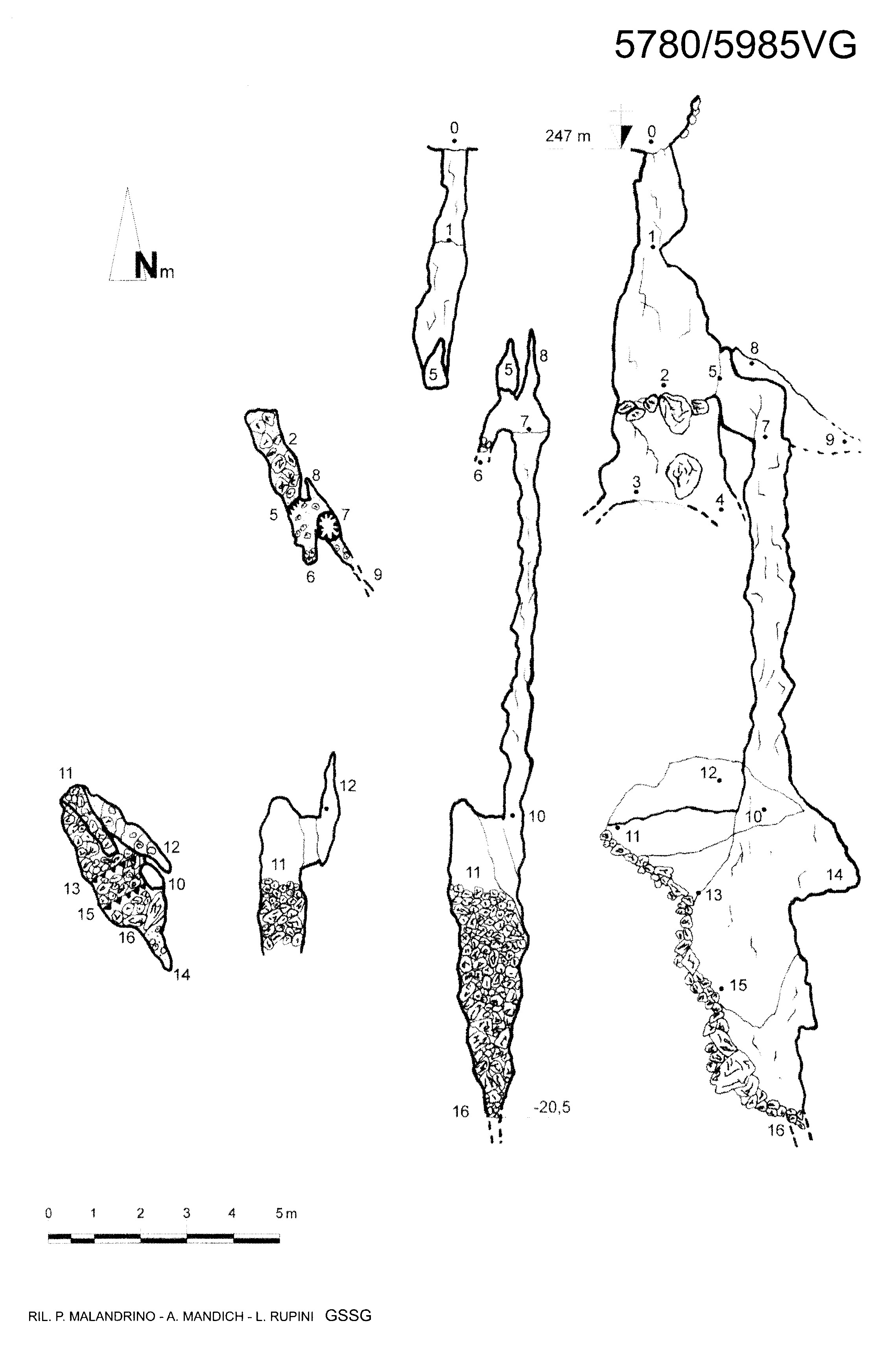 La grotta è impostata su di una frattura orientata 330°-150°. La notevole emissione d'aria percepibile momento dello scavo ha permesso di individuare una piccolissima fessura alla base del pozzo d'accesso che allargata porta, dopo 8 m in strettoia, in un ambiente di crollo più ampio (p.to 10 del rilievo), il cui pavimento inclinato è formato da massi, pietrisco e terra che, a causa del proseguimento dei lavori di scavo, ora forma un terrazzamento puntellato con tubi da ponteggio. L'incombere delle pietre accatastate ha però consigliato la sospensione dei lavori.