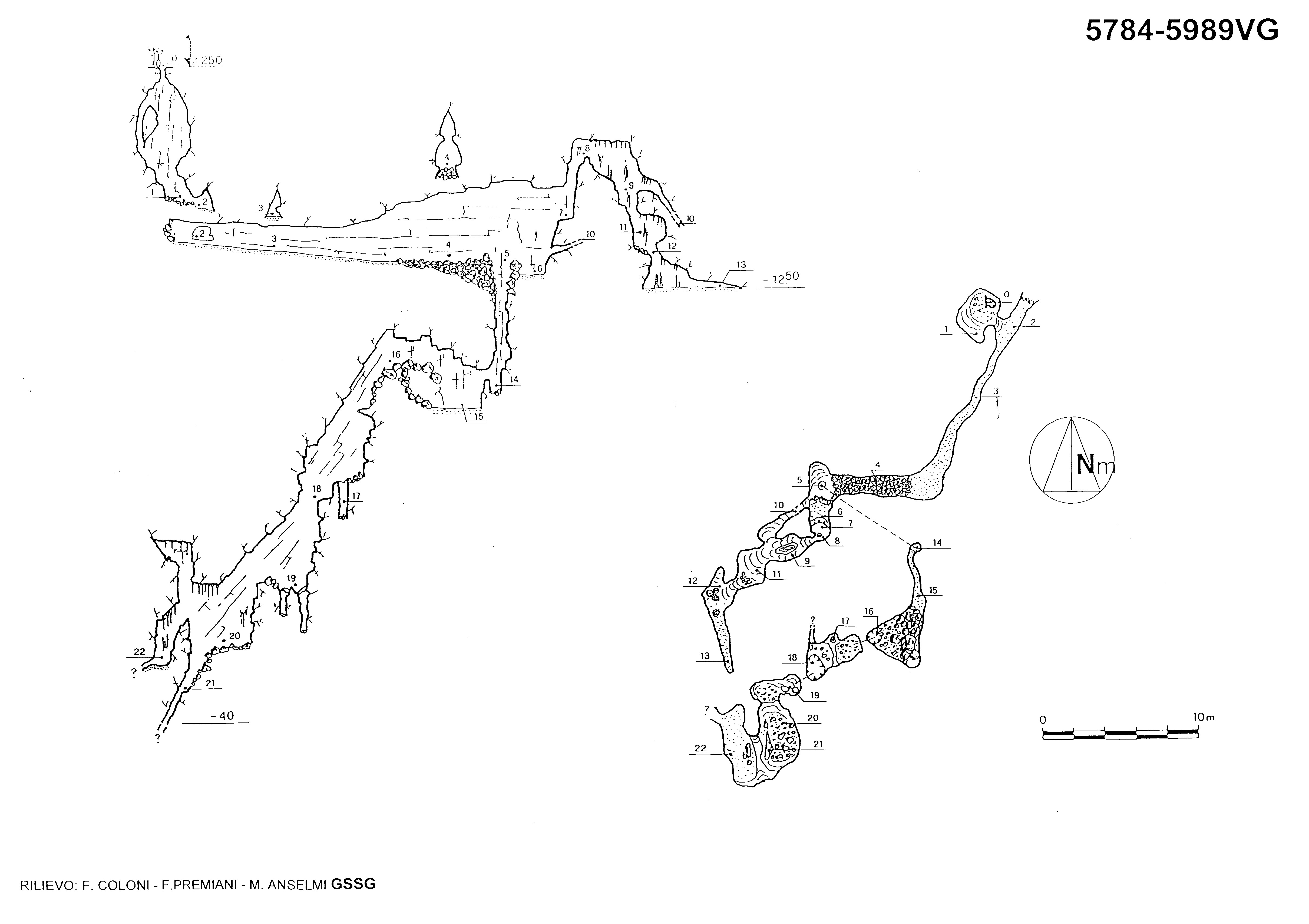 c) - un sistema di pozzi che raggiunge la massima profondità: dalla frana sopra descritta, si accede ad una serie di pozzi alternati ad una piccola sala, forse in relazione con le parti soprastanti, e ad una serie di ripiani. Al fondo della cavità, un lavori di scavo potrebbe rivelare ulteriori prosecuzioni. La morfologia è condizionata dall'assetto tettonico e si presenta come approfondimento di un sistema di fratturazione principale inclinato. Sono assenti i depositi argillosi.