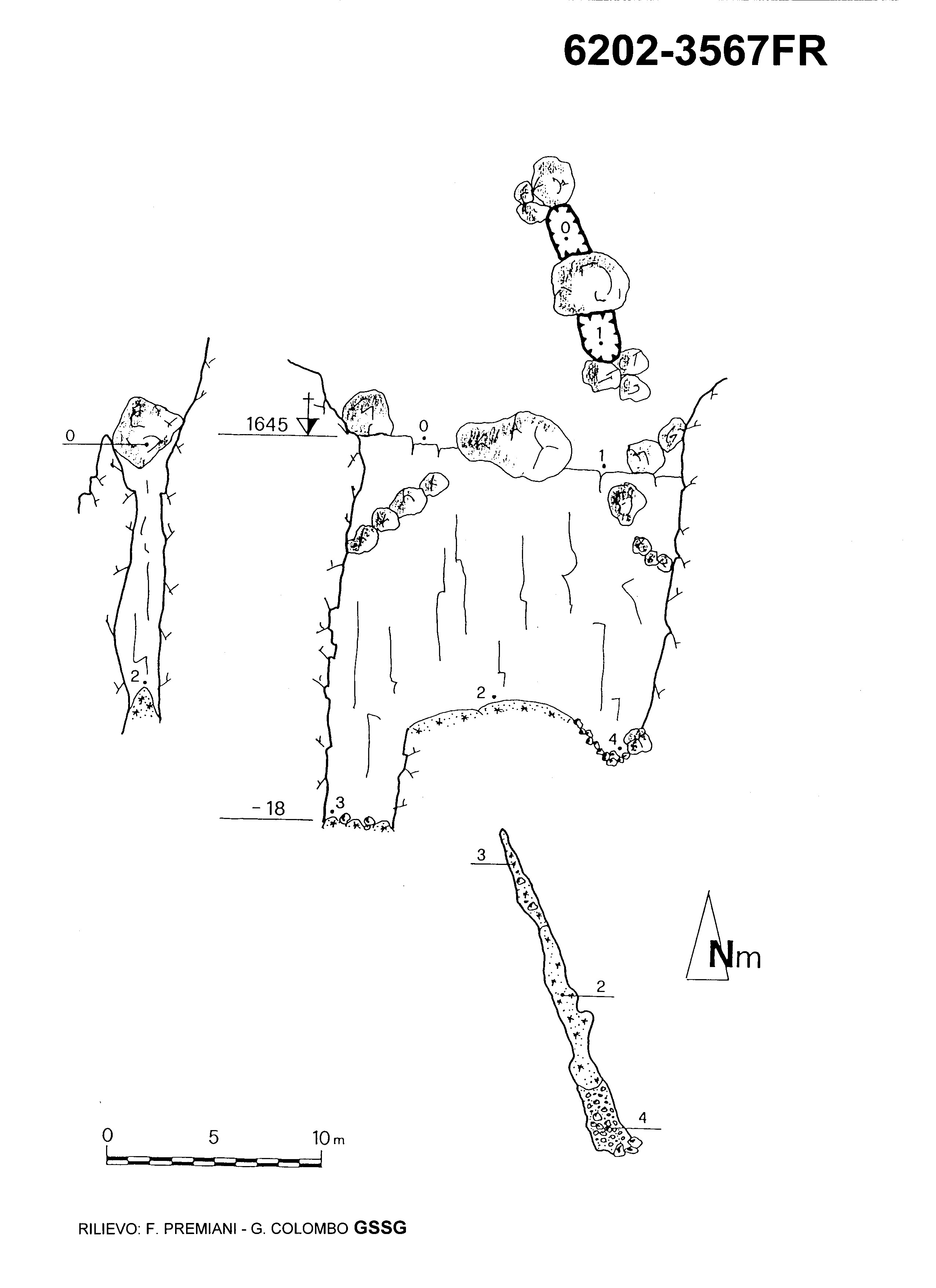 La cavità è impostata su di una frattura con orientamento 340°-160°. Un tappo di neve sul suo fondo occlude ogni possibile prosecuzione.