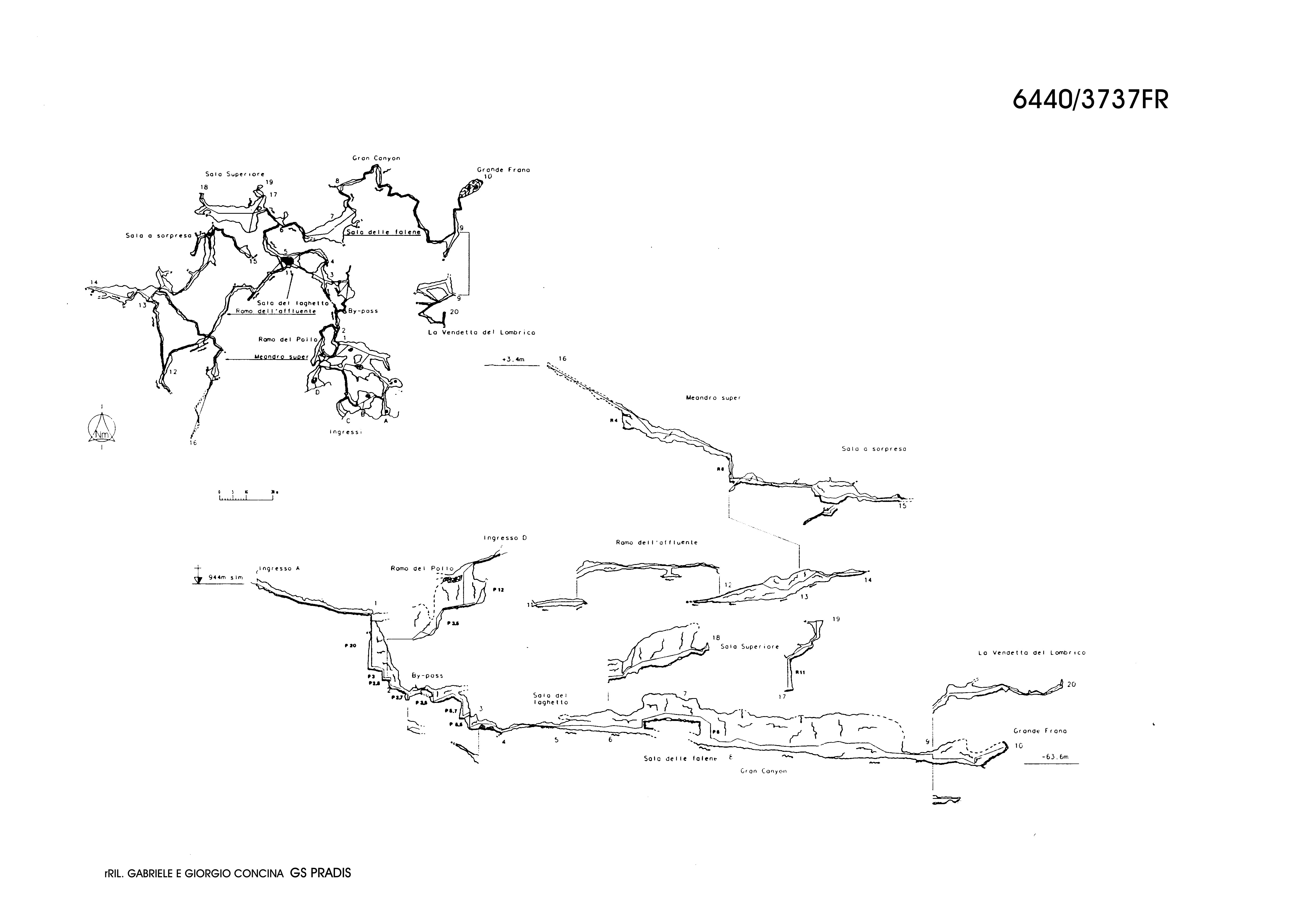 Si prosegue con un P5,7 ed un successivo fastidioso P5,5 in strettoia. Giunti alla base (punto 3), sulla sinistra parte uno stretto meandro in salita (percorribile per alcuni m) che sicuramente si collega con il meandro precedente al by pass.
